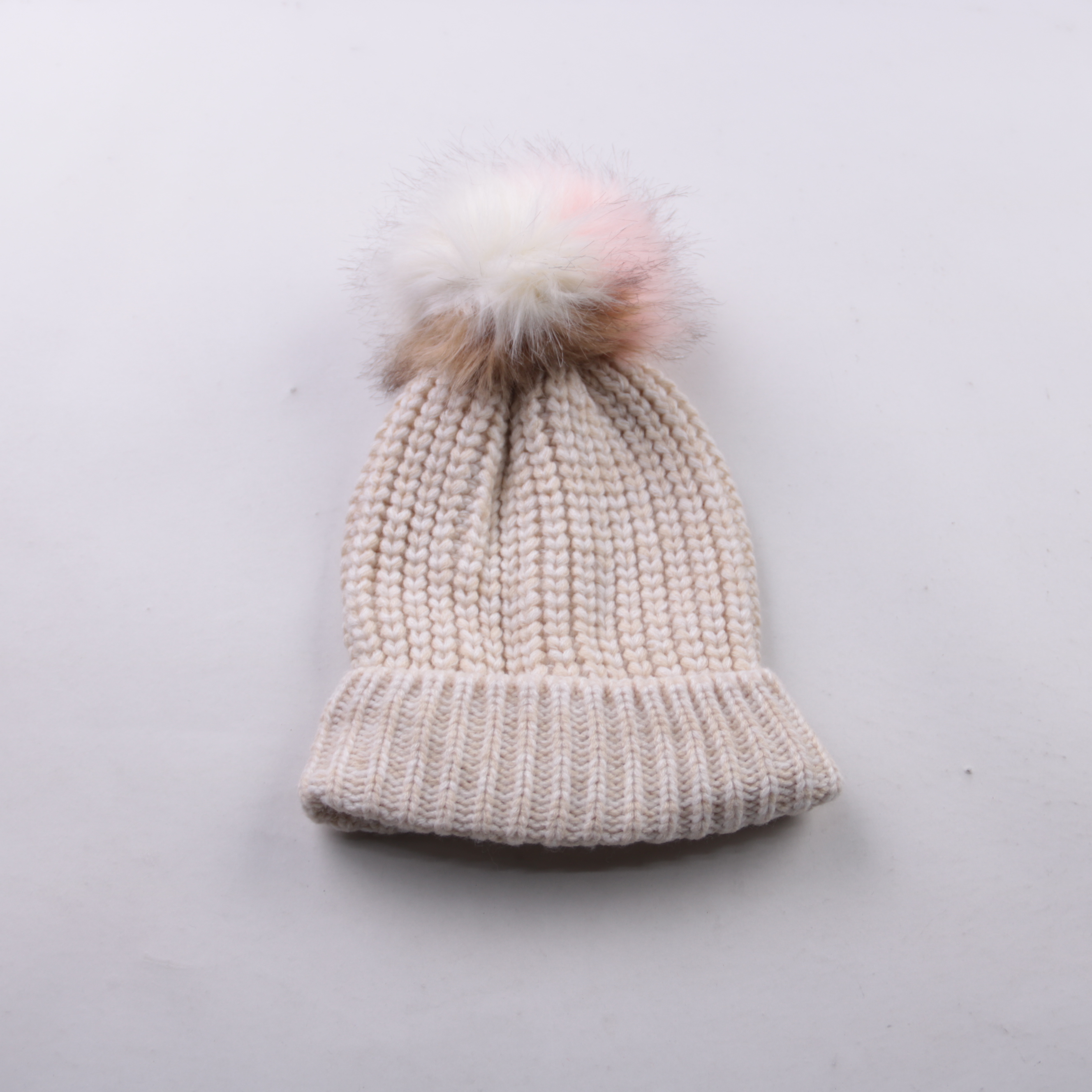 Вязаная шапка Primark бежевого цвета с пушистым помпоном. Подойдёт для холодной зимы и прогулок на улице благодаря плотной вязке и отвороту. Универсальный размер удобно садится по голове.