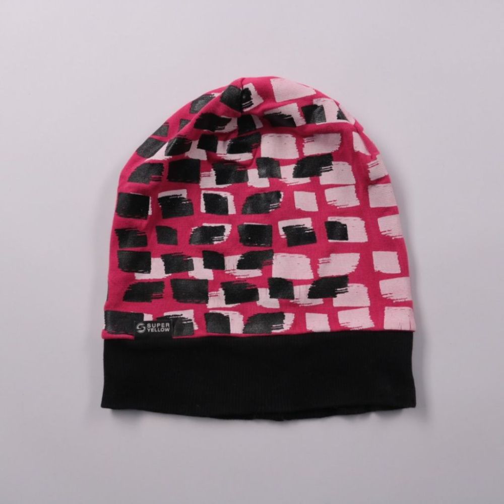 Трикотажная шапка Super Yellow с ярким розово-чёрно-белым принтом. Подойдёт на прохладную погоду весной и осенью для повседневных образов. Эластичная ткань хорошо тянется и комфортно садится по голове.