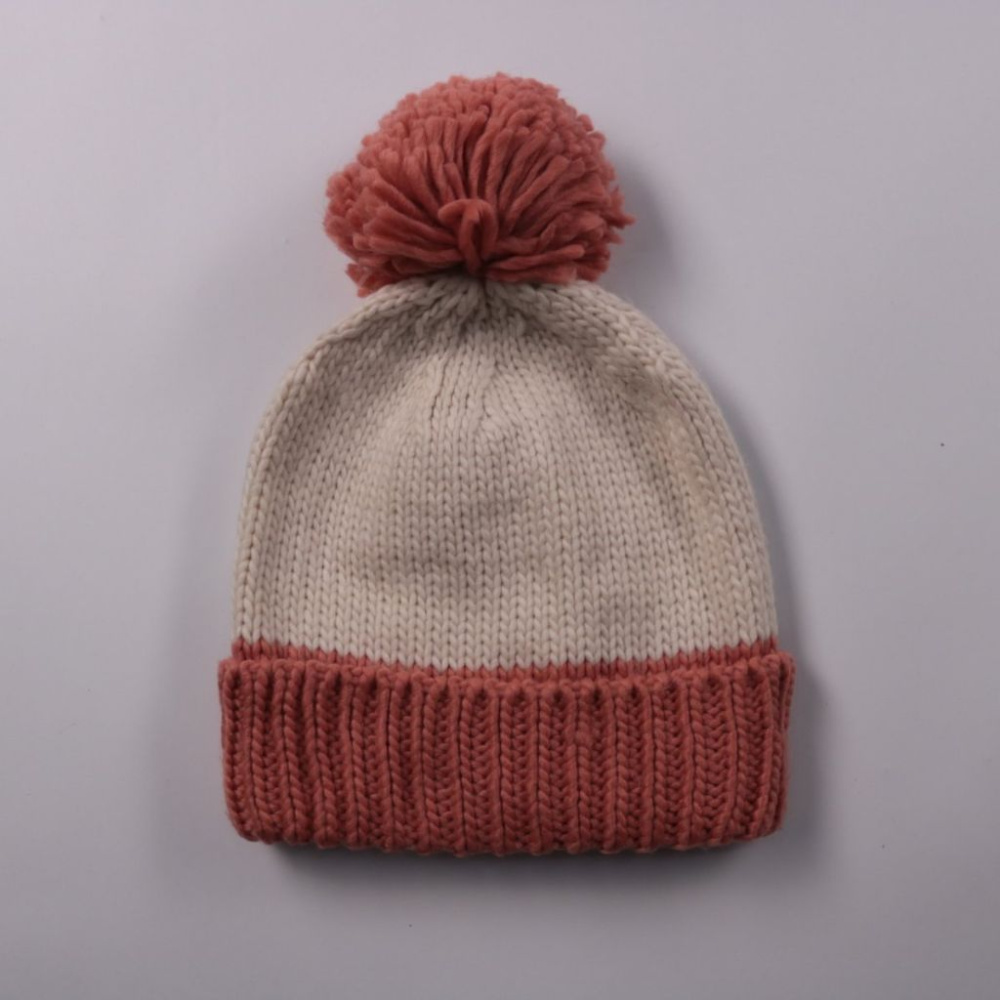 Вязаная шапка M&S с помпоном в бежево-коралловой расцветке. Подойдёт для зимних прогулок и повседневной носки, хорошо закрывает уши за счёт широкой отворотной резинки. Акриловая пряжа простая в уходе и быстро сохнет.