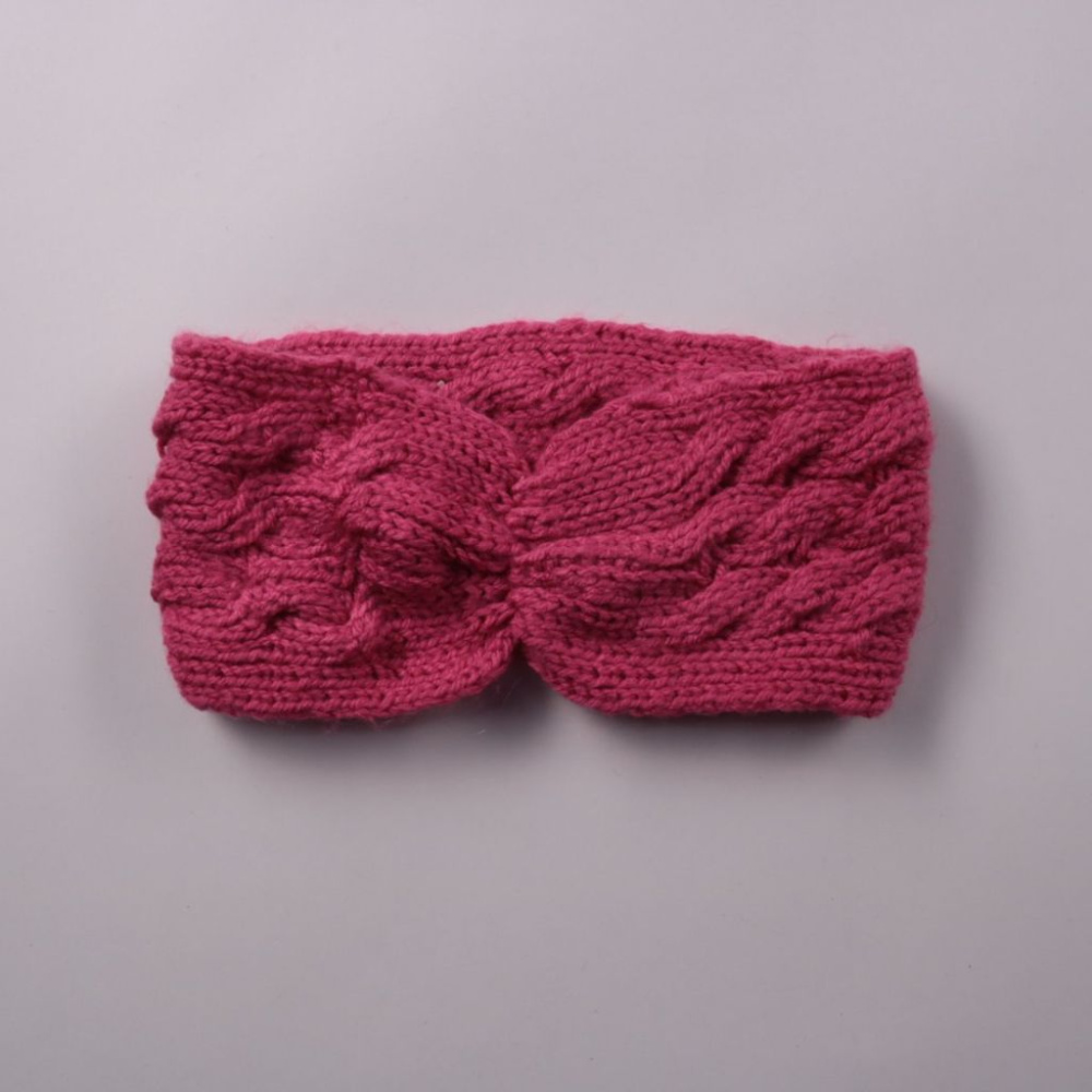 Вязаная повязка на голову с узором «косы» и декоративным узлом спереди. Подойдёт для прогулок в холодную погоду и для носки вместо шапки в межсезонье. Хорошо прикрывает уши и не портит укладку.