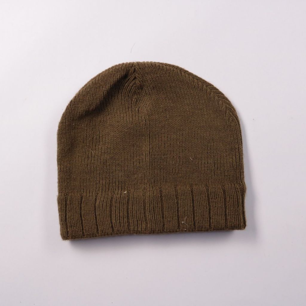 Вязаная шапка бини без бренда, спокойного коричневого оттенка. Подойдёт для повседневной носки в холодную погоду и прогулок. Акриловая пряжа хорошо держит форму и проста в уходе.