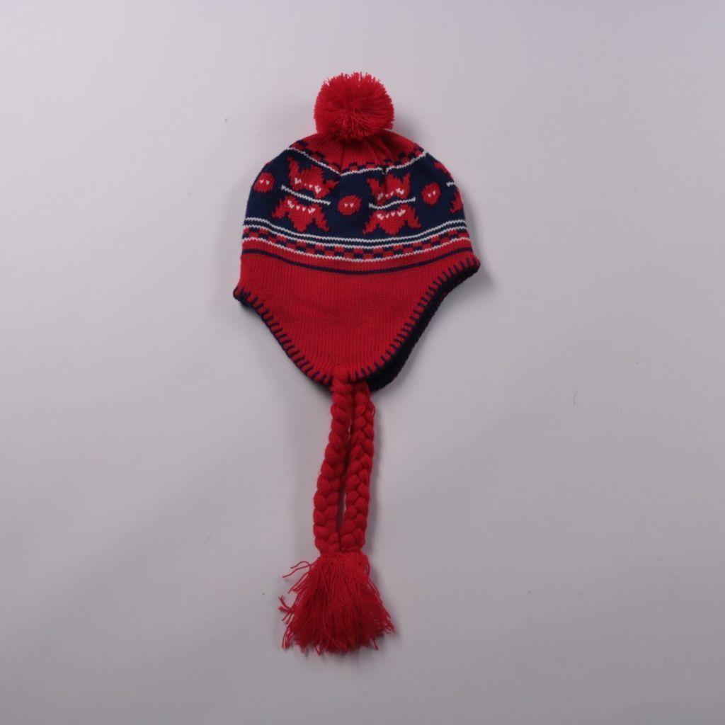 Вязаная шапка-ушанка с помпоном и длинными косичками-кисточками, выполнена в красно-синей гамме с орнаментом. Подойдёт для зимних прогулок и активного отдыха на улице. Плотная вязка хорошо защищает уши от ветра.