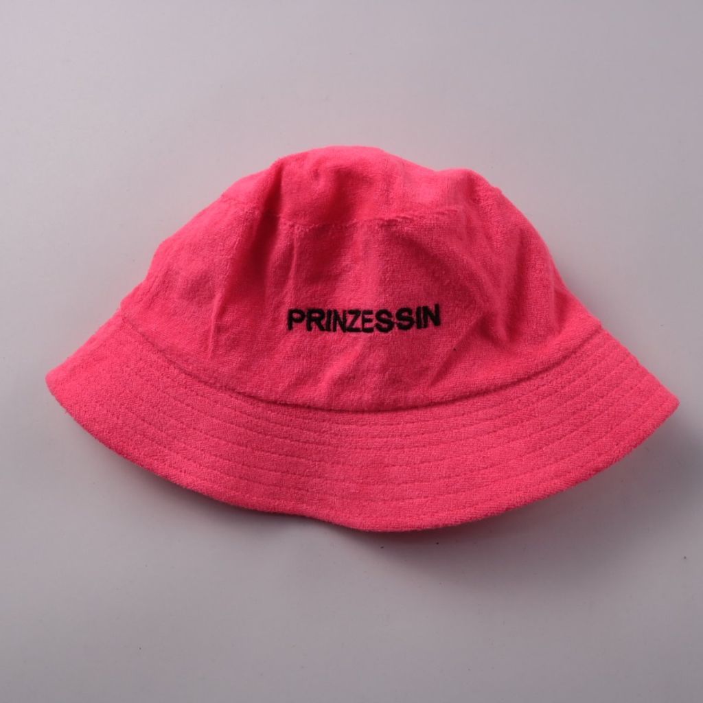 Розовая панама с вышитой надписью PRINZESSIN. Подойдёт для летних прогулок и отдыха на природе, защищает голову и лицо от солнца. Мягкий материал легко складывается и не занимает много места в сумке.
