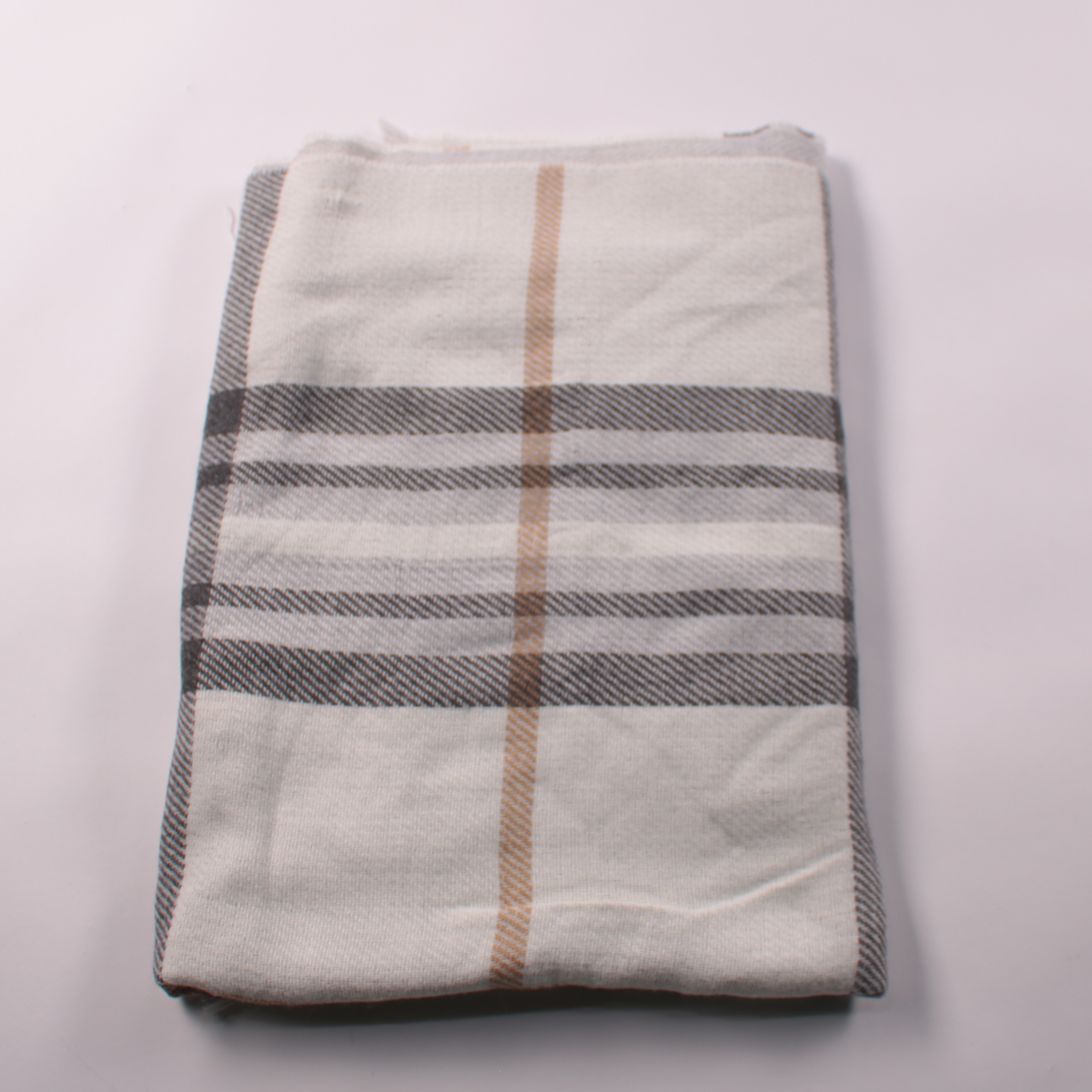 Шарф в клетку в серо-бежевой гамме с тонкой рыжей линией и бахромой по краю. Подойдёт для повседневных образов осенью и весной, хорошо сочетается с пальто и куртками нейтральных оттенков. Лёгкий, удобно складывается и не занимает много места в сумке.