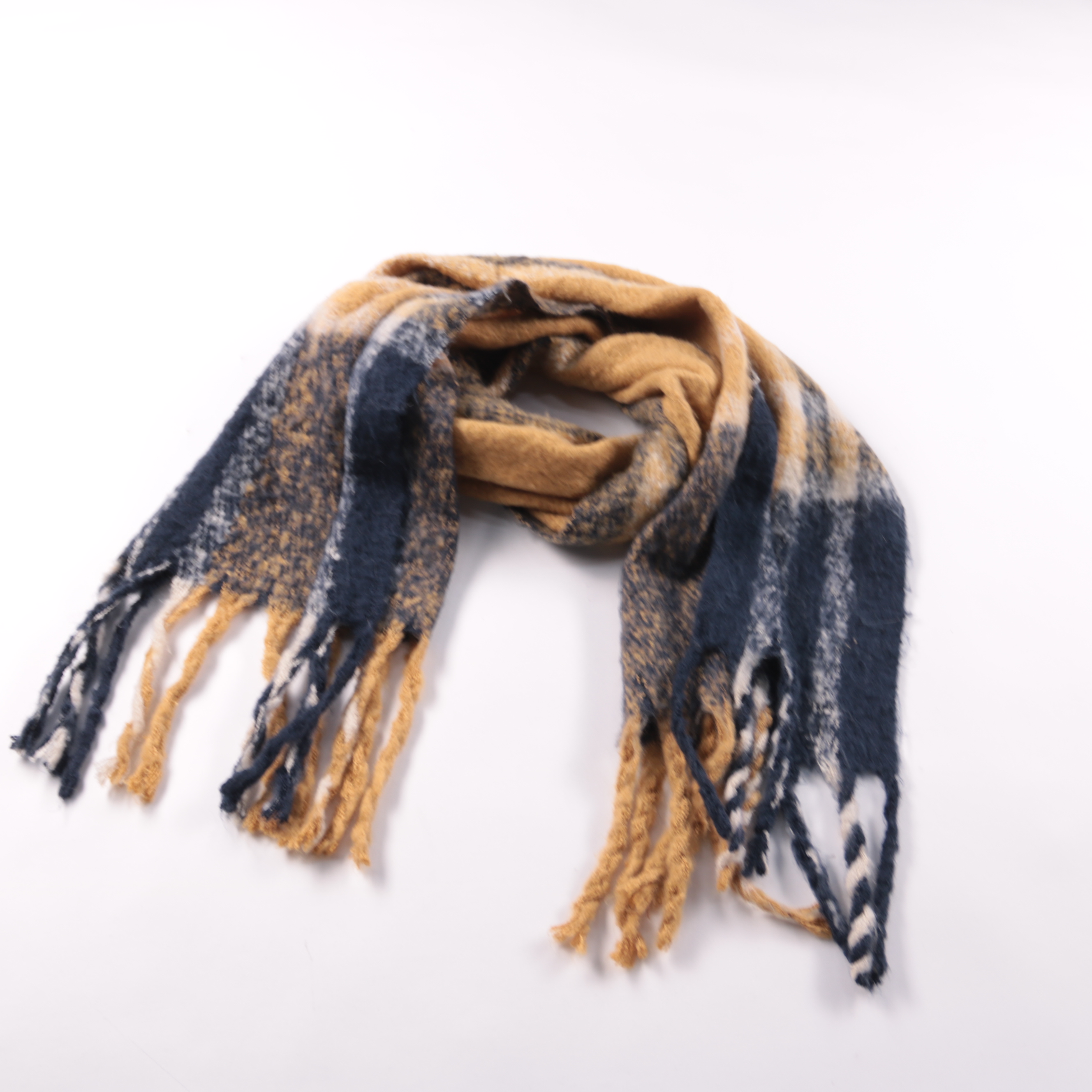 Тёплый шарф с бахромой в сине-бежевой гамме и фактурной мягкой вязкой. Подойдёт для повседневных образов в холодную погоду и легко сочетается с однотонной верхней одеждой. Удобно драпируется и хорошо закрывает шею от ветра.