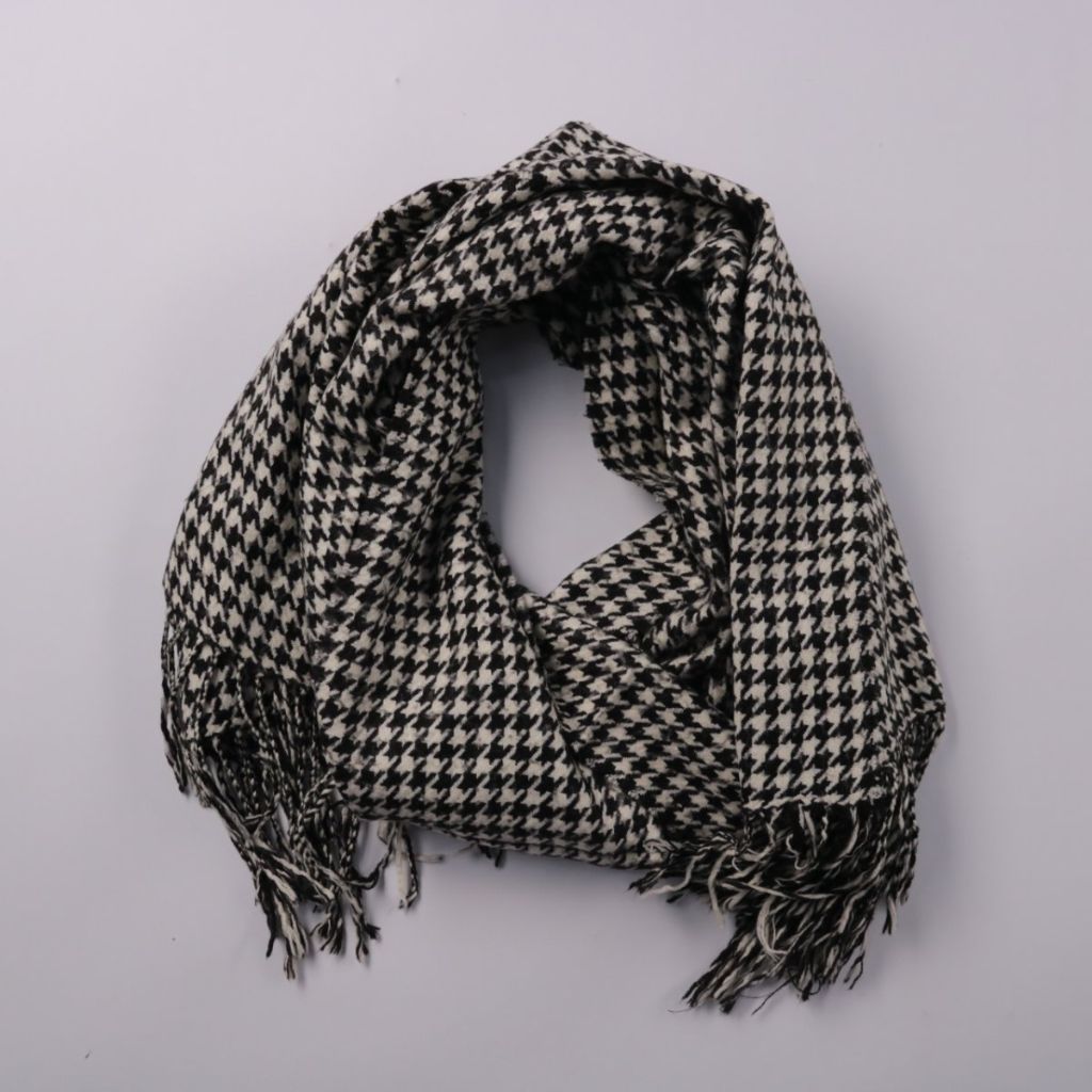 Шарф с узором «гусиная лапка» в чёрно-белой гамме и с бахромой по краю. Подойдёт для повседневных образов и офисного стиля в прохладную погоду. Легко драпируется и добавляет тепла без лишнего объёма.