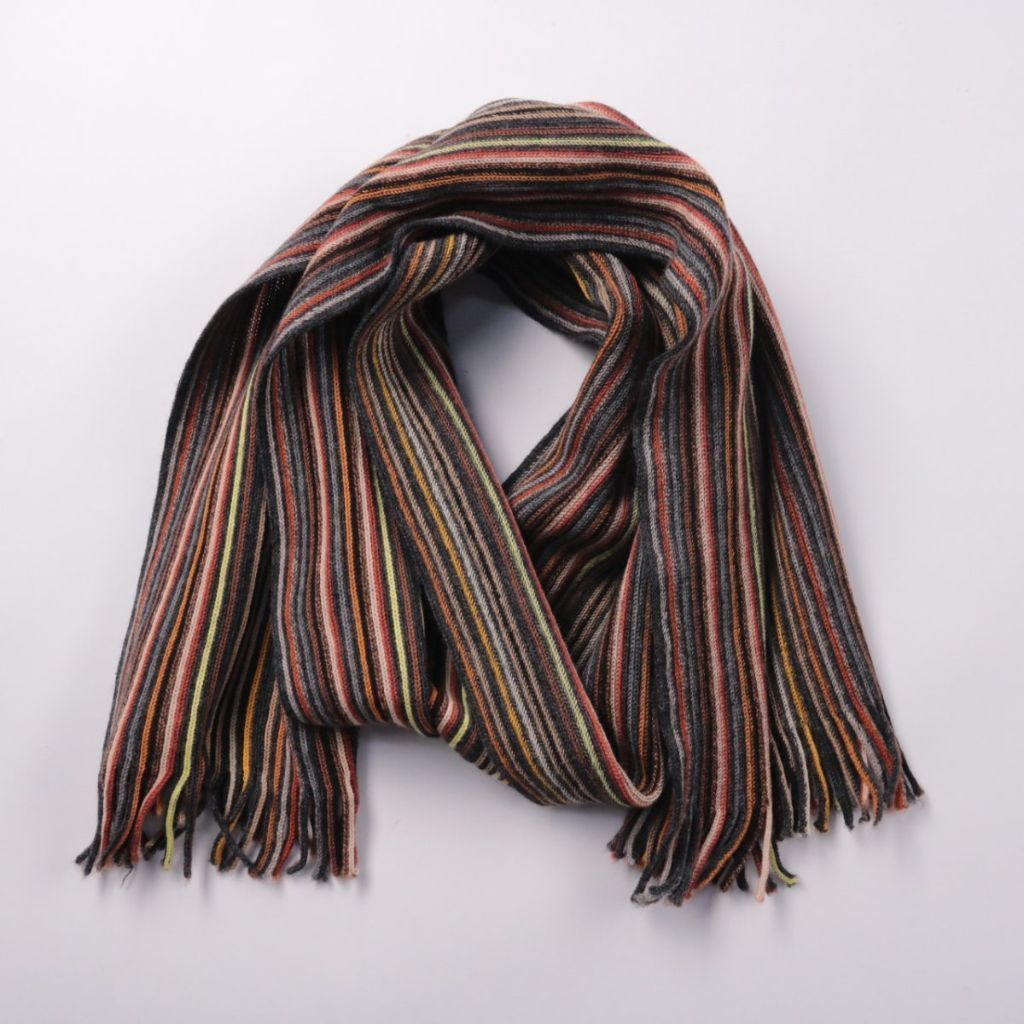 Трикотажный шарф в полоску с кисточками, бренд не указан. Подойдёт для повседневных образов в прохладную погоду, можно носить с пальто или курткой. Удобно драпируется и добавляет тепла за счёт плотной вязки.