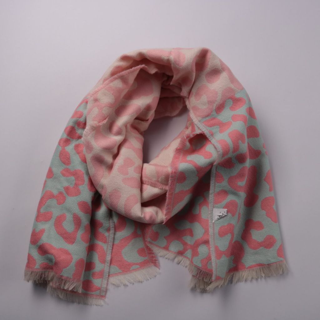 Шарф из 100% акрила с леопардовым принтом в розово-голубых тонах и бахромой по краю. Подойдёт для повседневных образов в прохладную погоду осенью и весной. Акрил лёгкий и простой в уходе, быстро сохнет.