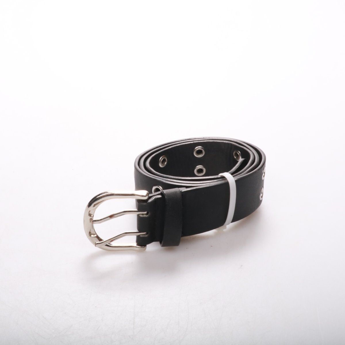 Черный ремень с металлической пряжкой и люверсами по всей длине. Подойдет для джинсов, брюк или поверх платья в повседневных и гранж-образах. Много отверстий позволяет удобно отрегулировать посадку по талии.