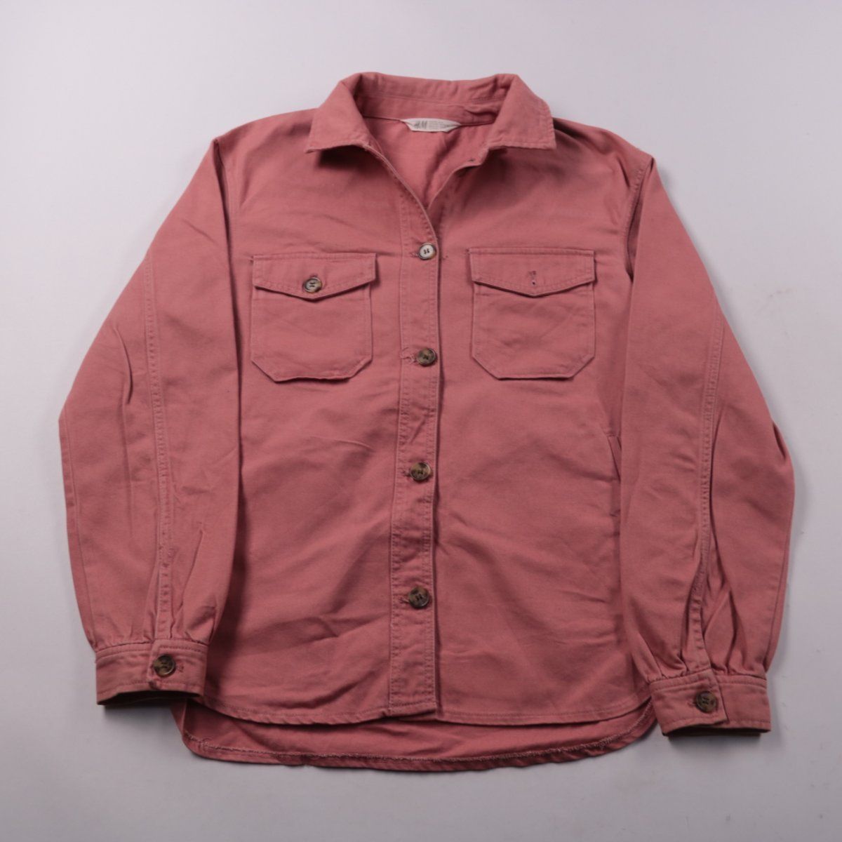 Рубашка H&M пыльно-розового цвета из хлопка, с отложным воротником и застёжкой на пуговицы. Подойдёт для школы и повседневных образов в прохладную погоду как самостоятельный верх или вторым слоем. Натуральный хлопок хорошо дышит и комфортен в носке.