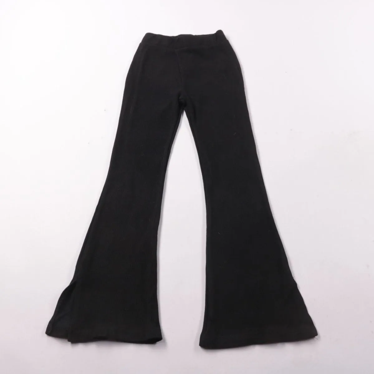 Черные брюки HEMA из мягкого эластичного трикотажа с клешем книзу и поясом на резинке. Подойдут девочке на рост 122–128 см для школы или прогулок в прохладную погоду и в помещении. Ткань хорошо тянется и не стесняет движений.