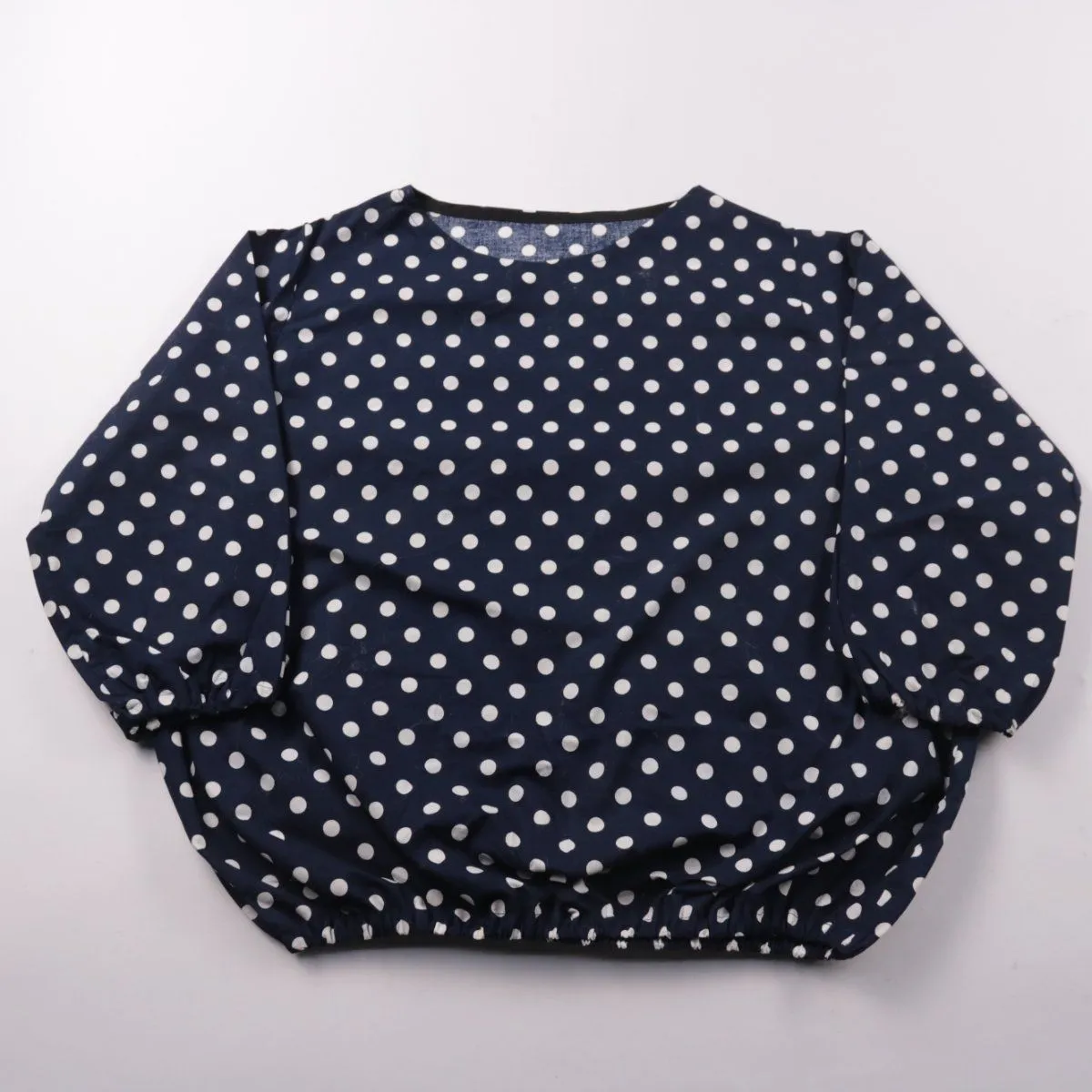 Детский топ для девочки в тёмно-синем цвете в белый горох, с объёмными рукавами и резинкой по низу. Подойдёт для повседневной носки в сад, школу или на прогулку, хорошо сочетается с джинсами и юбками. Эластичная сборка по низу помогает топу держать форму и не задираться.