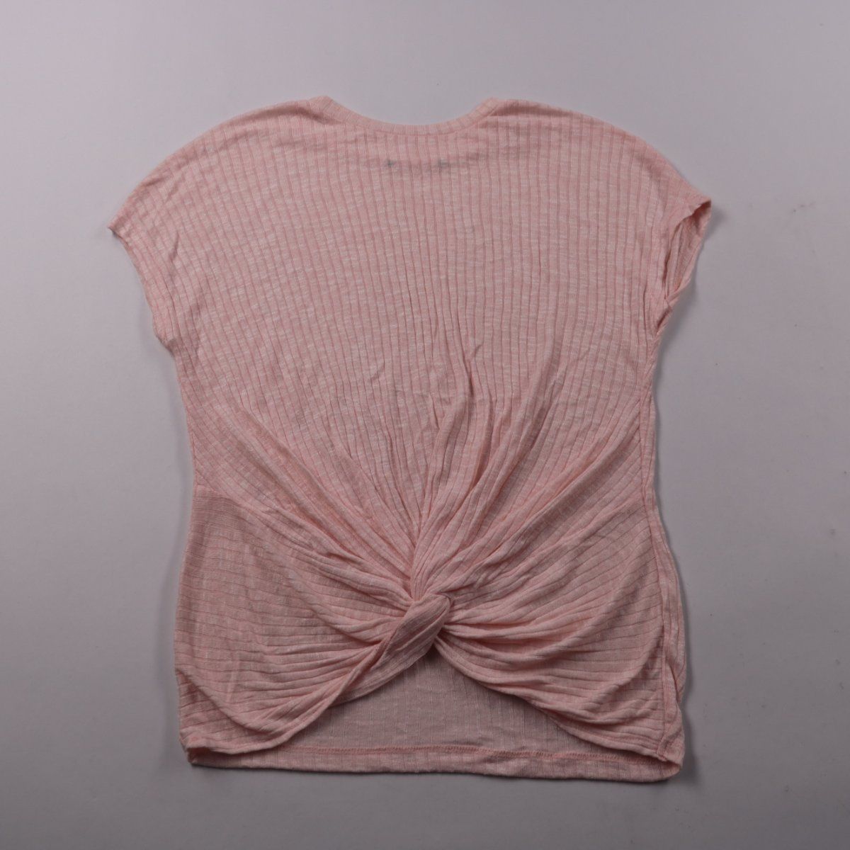 Розовая трикотажная футболка в рубчик с коротким рукавом и декоративным узлом спереди, бренд не указан. Подойдёт для повседневной носки летом или в помещении с юбкой, шортами или джинсами. Мягкий эластичный материал удобно сидит и не стесняет движений.