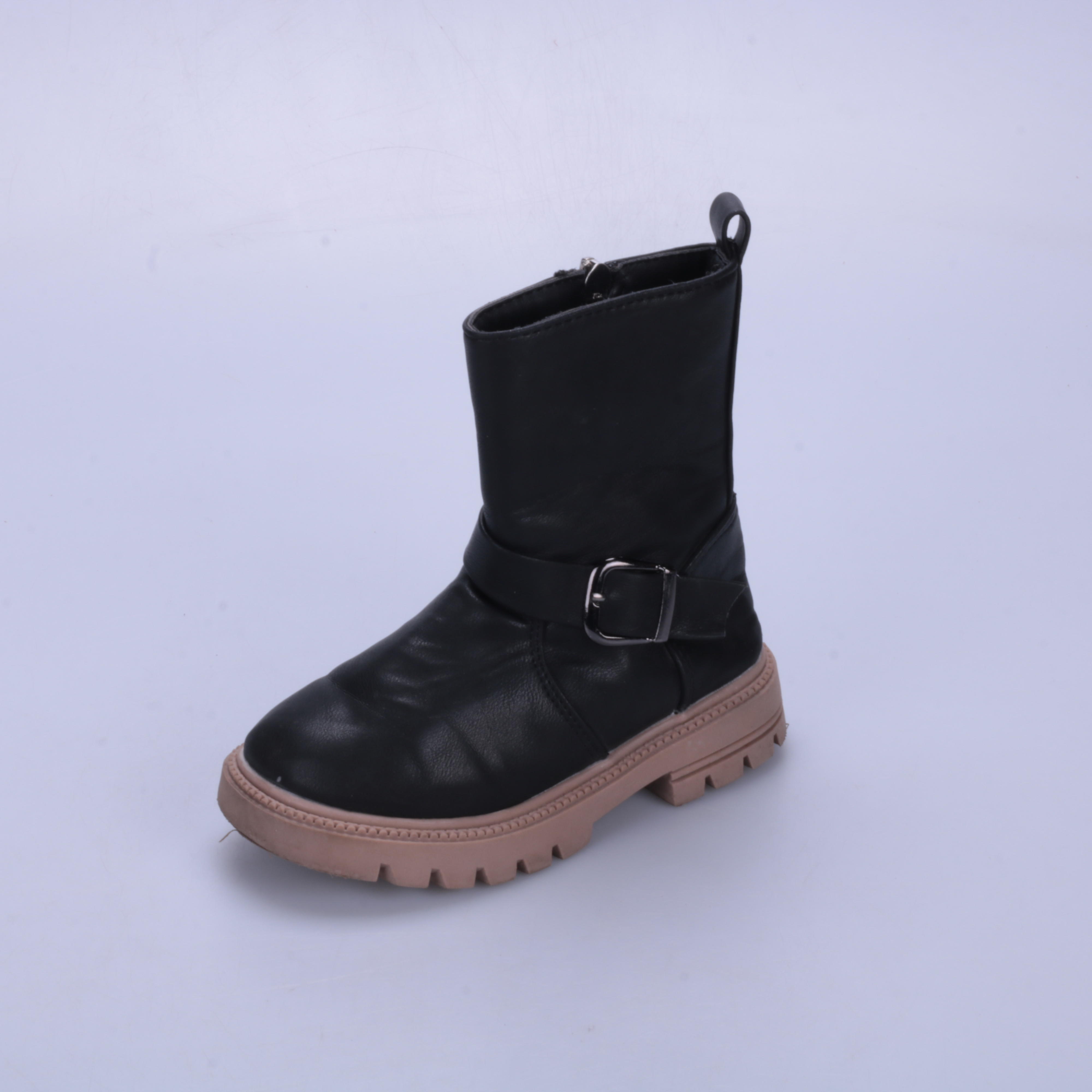 Детские ботинки на молнии с ремешком и пряжкой, без указания бренда. Подойдут для прогулок в прохладную погоду весной и осенью, плотная тракторная подошва помогает увереннее идти по мокрому асфальту и грунту.