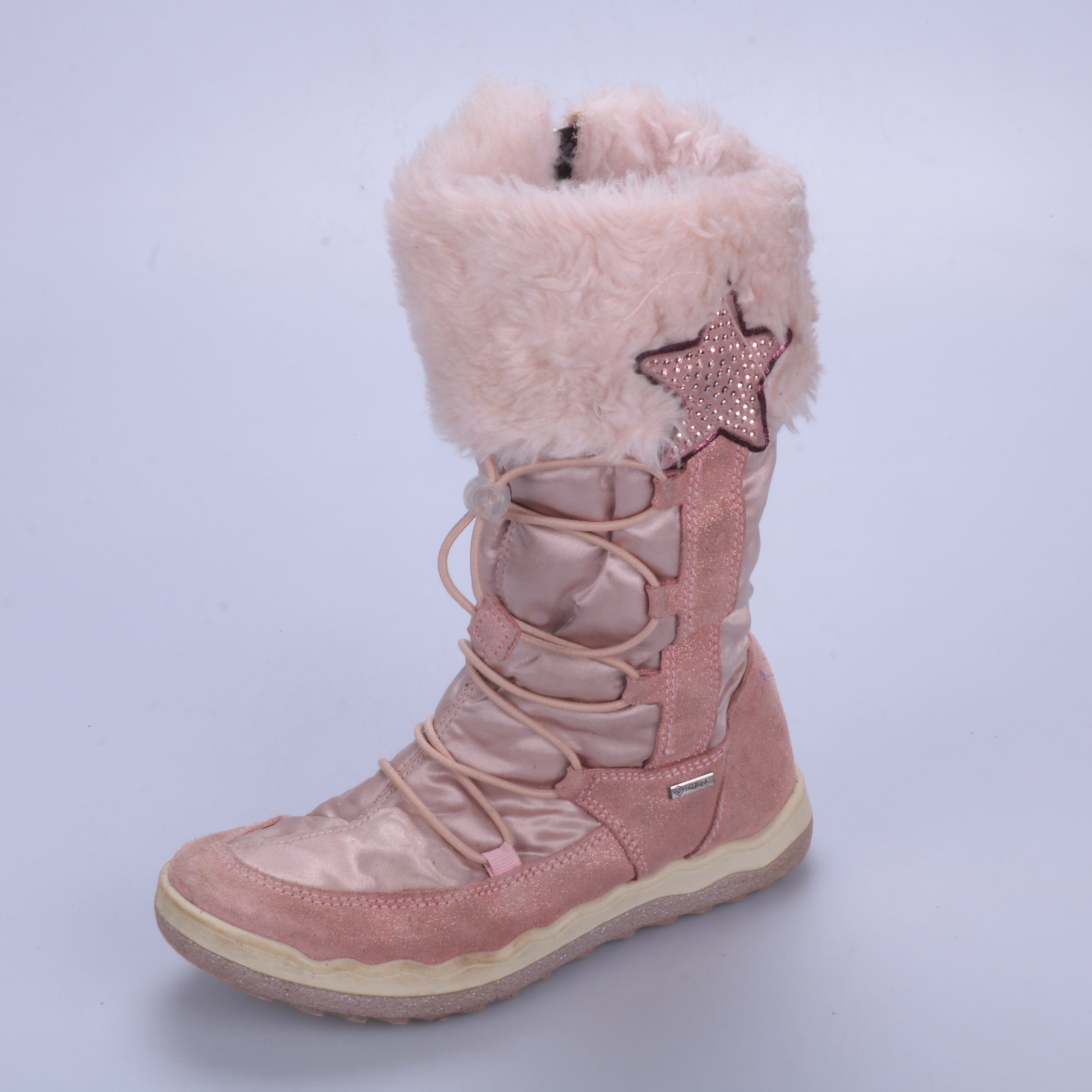 Зимние сапоги для девочки в нежно-розовом цвете с пушистым отворотом и декоративной звездочкой. Подойдут для прогулок в холодную погоду, удобно фиксируются шнуровкой и боковой молнией. Рифлёная подошва помогает увереннее ходить по скользкой поверхности.