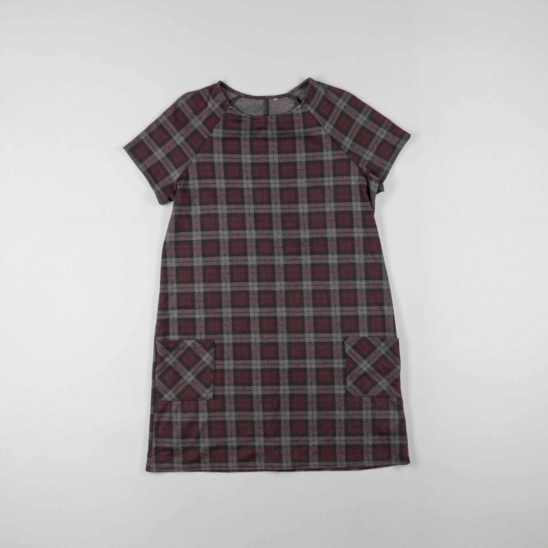 Детское платье в клетку бордово-серого цвета, прямого кроя с коротким рукавом и двумя накладными карманами спереди. Подойдёт для школы, прогулок и повседневной носки в прохладную погоду. Практичный материал и спокойная расцветка хорошо сочетаются с вод...