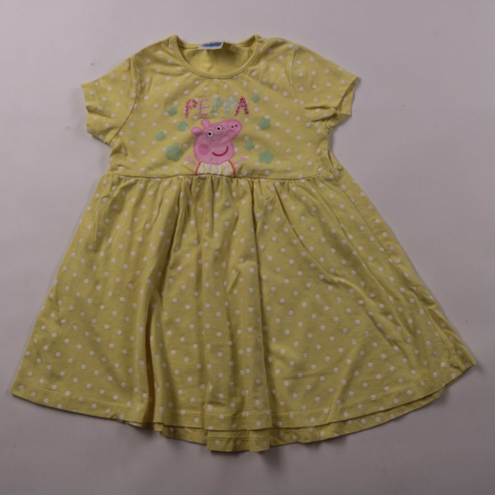Детское платье Peppa Pig жёлтого цвета в белый горошек, с коротким рукавом и принтом Пеппы на груди. Подойдёт для сада, прогулок и дома в тёплую погоду. Натуральный хлопок хорошо пропускает воздух и комфортен в носке.