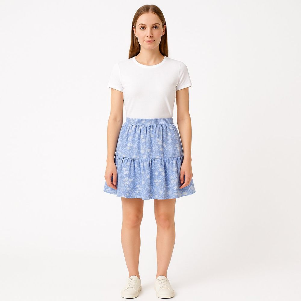 Юбка C&A для девочки, лёгкая и мягкая, с голубым принтом. Модель на эластичном поясе и с ярусным кроем подойдёт для школы, прогулок и летних мероприятий. Пояс-резинка удобно сидит и не сковывает движения.
