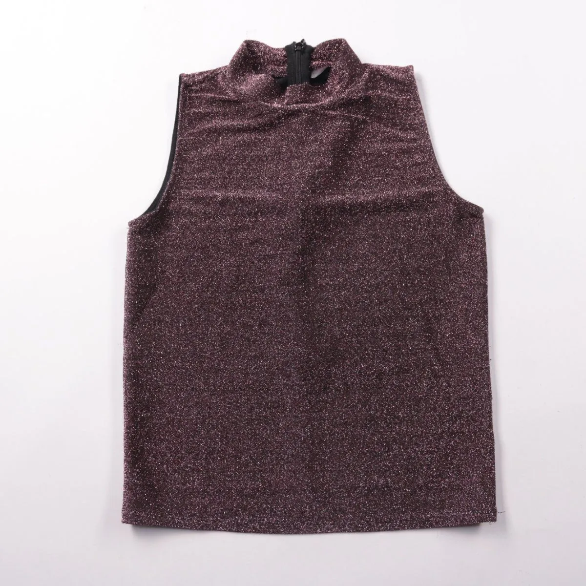 Кофта CoolCat без рукавов с высоким воротником и молнией сзади, выполнена из блестящего бордового трикотажа с люрексом. Подойдёт для праздников и выступлений, а также для повседневных образов поверх футболки или водолазки. Лёгкая и не сковывает движения, удобно надевать и снимать благодаря молнии.