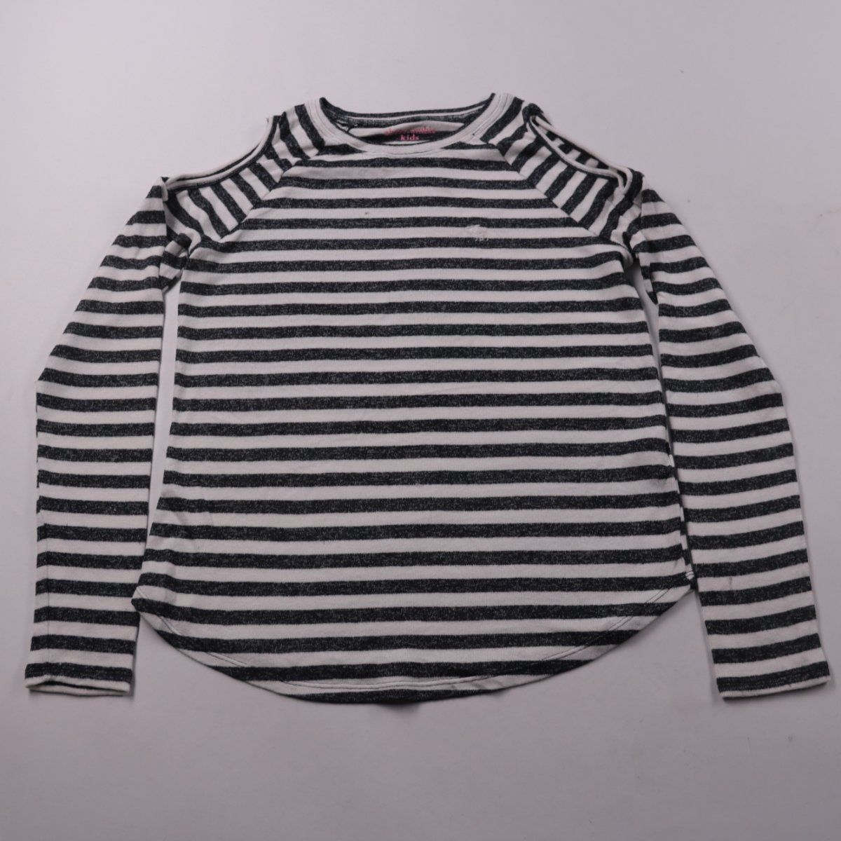 Кофта Abercrombie Kids в чёрно-белую полоску с вырезами на плечах и длинными рукавами. Подойдёт для школы, прогулок и повседневных образов в прохладную погоду. Мягкий трикотаж хорошо тянется и легко сочетается с джинсами и юбками.