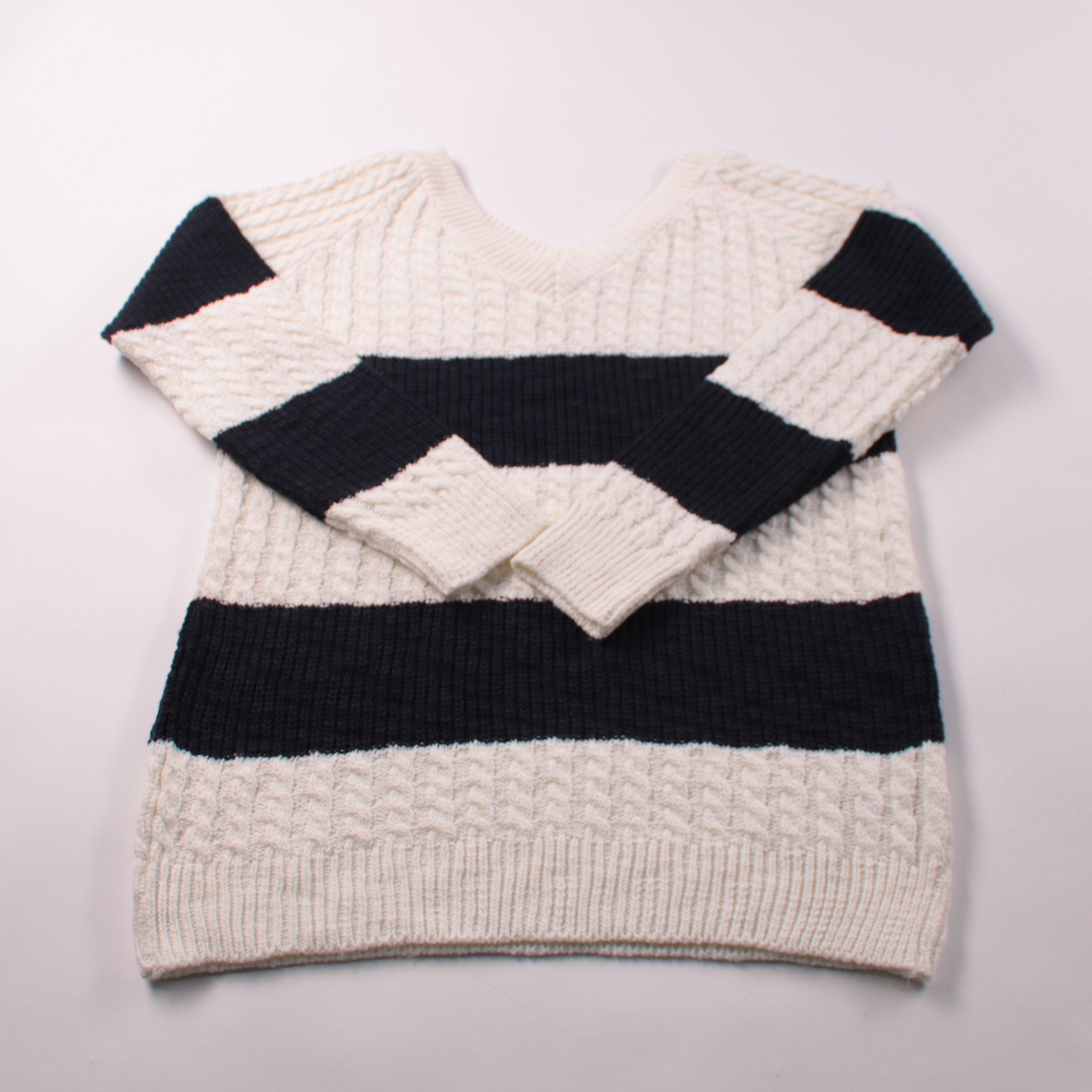 Вязаный свитер V с рельефным узором и контрастными чёрными полосами. Подойдёт для школы и прогулок в прохладную погоду, удобно носить как самостоятельный слой или под куртку. Акриловая пряжа мягкая и неприхотливая в уходе.