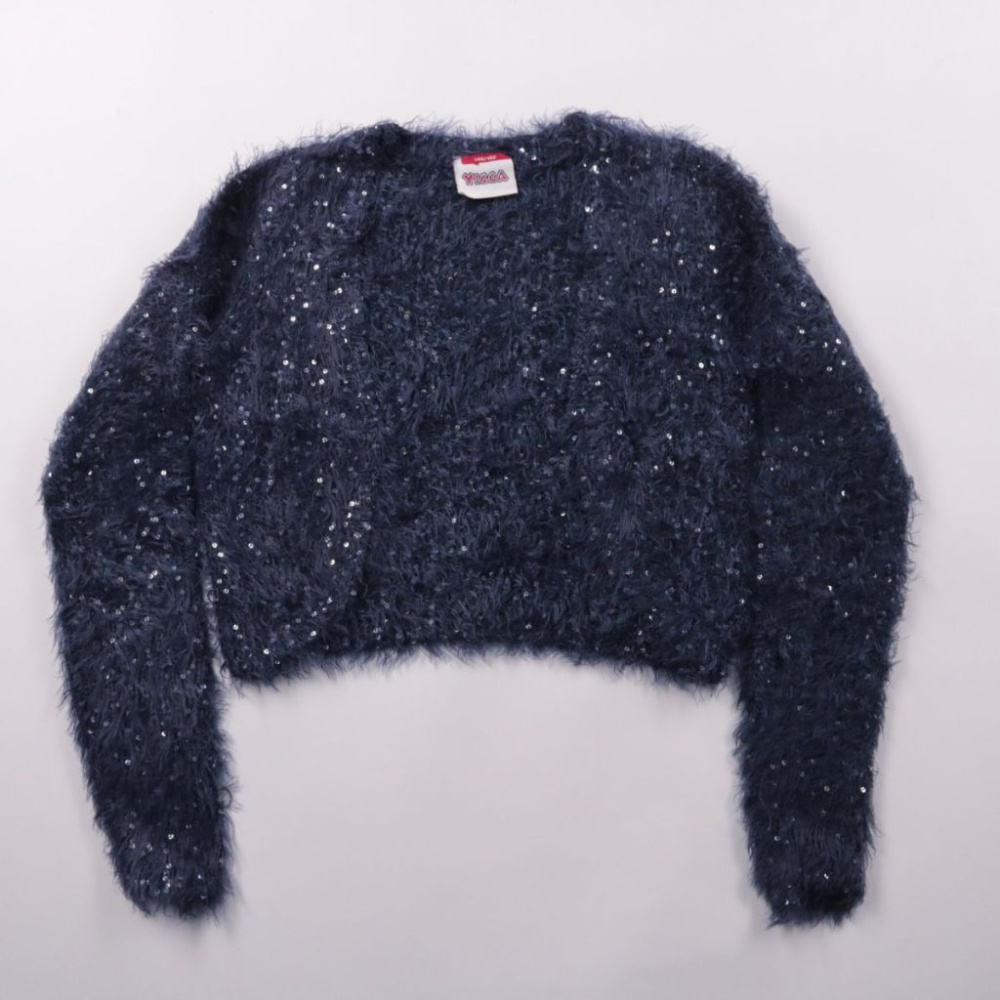 Вязаный свитер Yigga тёмно-синего цвета с пушистой фактурой и пайетками. Подойдёт для школы и прогулок в прохладную погоду, хорошо смотрится с джинсами и юбками. Лёгкий и тёплый, не требует сложного ухода.