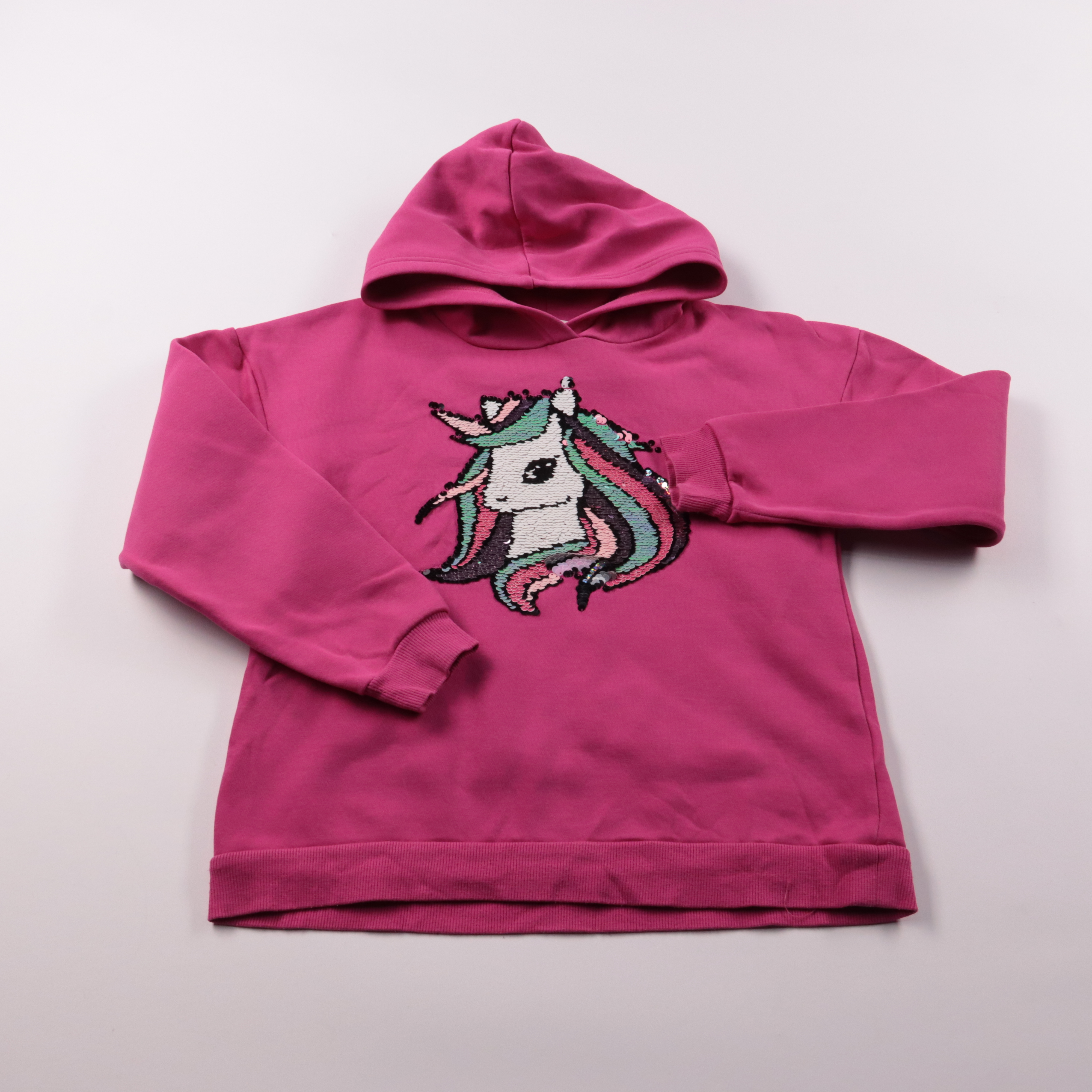 Худи H&M ярко-розового цвета с капюшоном и крупной аппликацией единорога из пайеток. Подойдёт для прогулок и школы/садика в прохладную погоду, удобно носить как верхний слой. Ткань с хлопком приятна к телу и хорошо переносит стирку.