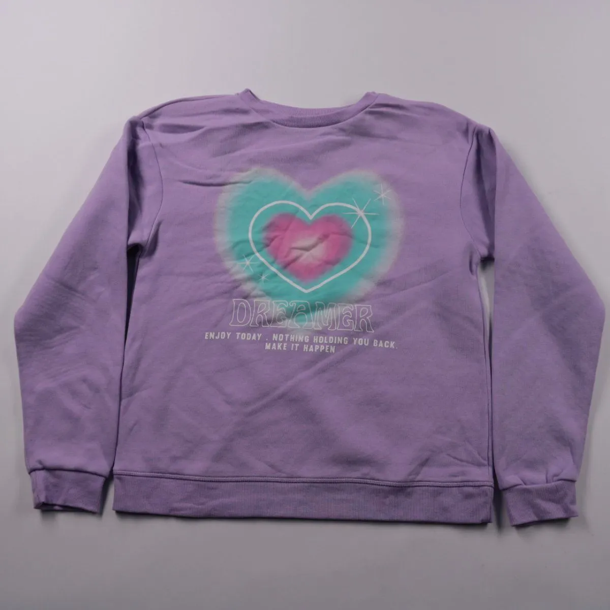 Толстовка Primark лавандового цвета с принтом «Dreamer» и сердцем. Подойдёт для школы и прогулок в прохладную погоду, мягкая изнутри. Практичный вариант: легко комбинируется с джинсами и спортивными брюками.
