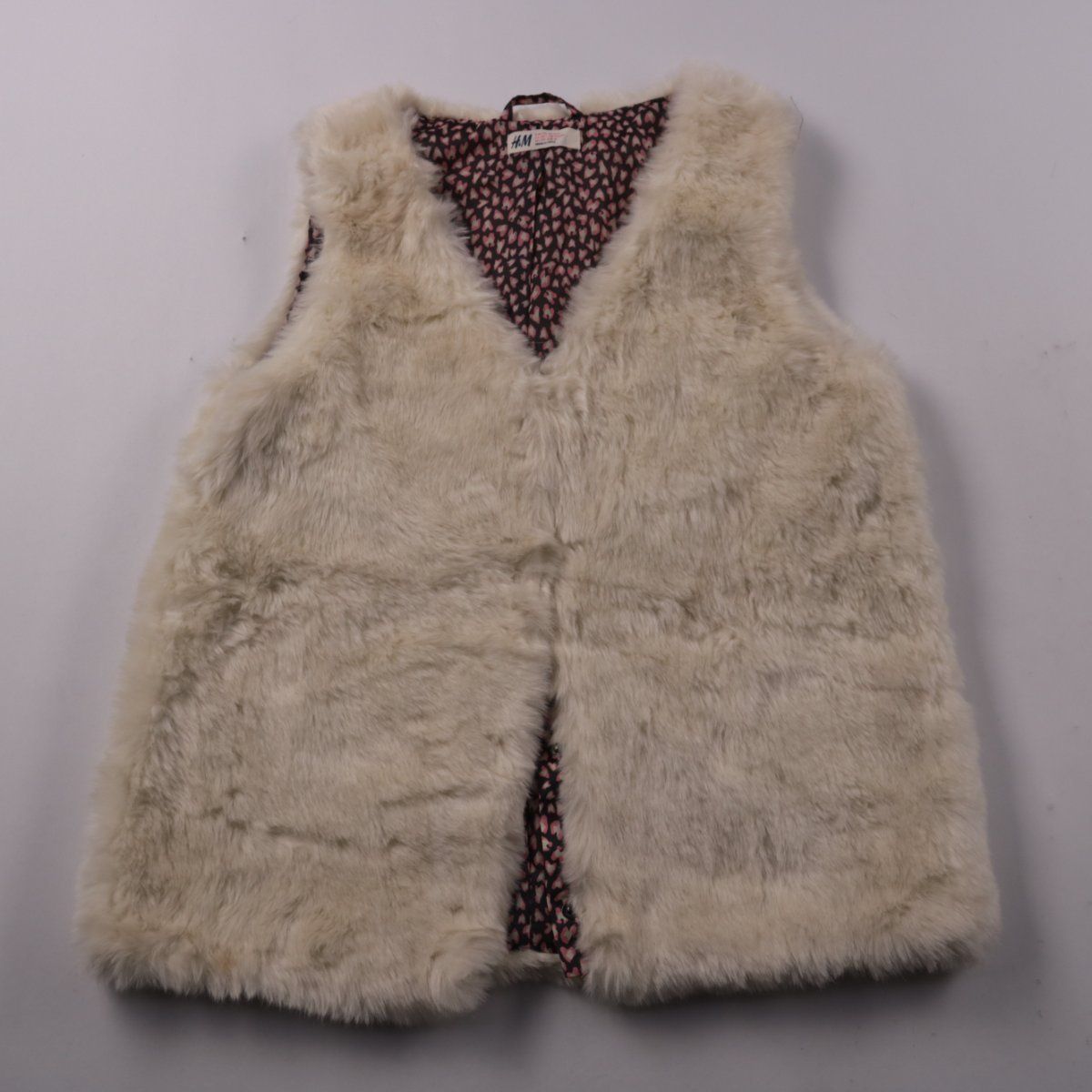 Меховой жилет H&M из искусственного меха молочного оттенка с подкладкой с принтом. Подойдёт для прохладной весны/осени и для многослойных образов поверх свитера или худи. Практичное преимущество — лёгкий и тёплый, не стесняет движения за счёт отсутствия рукавов.