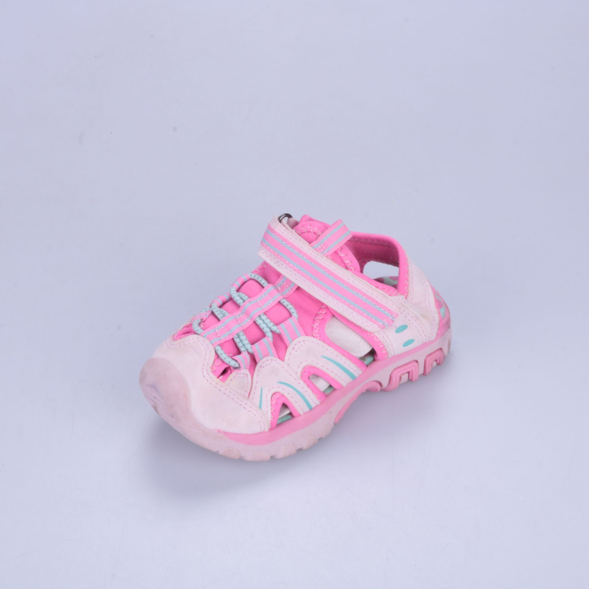 Детские сандалии для девочки в розово-бело-голубой расцветке, с закрытым носком и фиксацией на липучке. Подойдут для прогулок и активных игр летом. Рельефная подошва обеспечивает более уверенное сцепление с поверхностью.