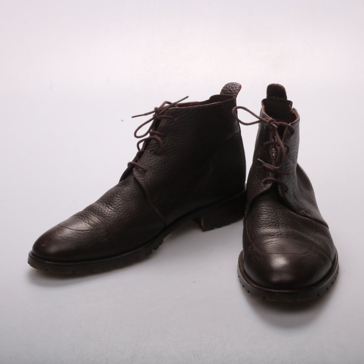 Мужские кожаные ботинки на шнуровке без указанного бренда, темно-коричневого цвета, с фактурной кожей и каблуком. Подойдут для повседневной носки в межсезонье и прохладную погоду. Рельефная резиновая подошва обеспечивает более уверенное сцепление на улице.