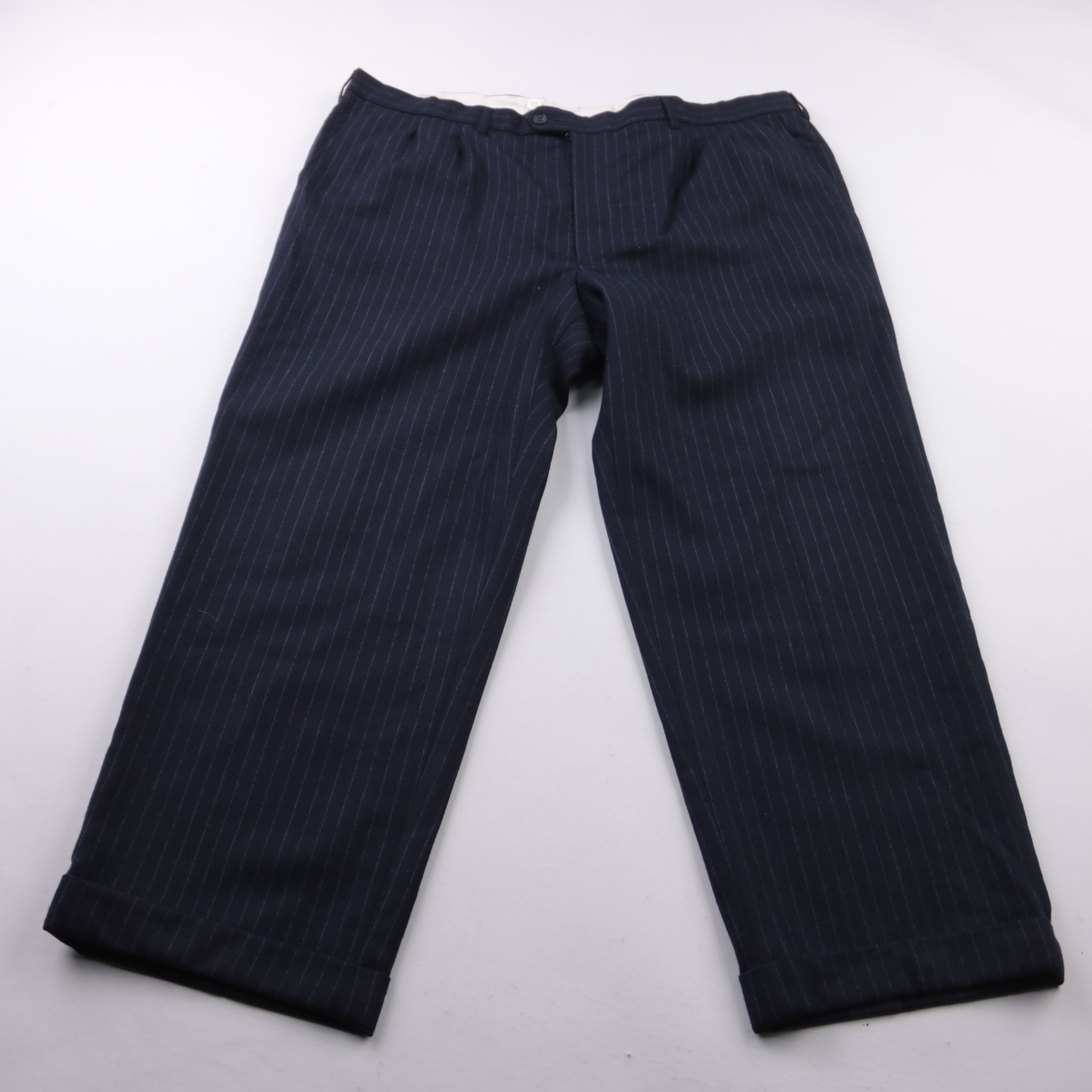 Мужские классические брюки в тонкую полоску, бренд не указан. Подойдут для офиса и деловых встреч, легко сочетаются с рубашкой и пиджаком. Практичный плюс — немаркая тёмная ткань и аккуратная посадка для повседневной носки.