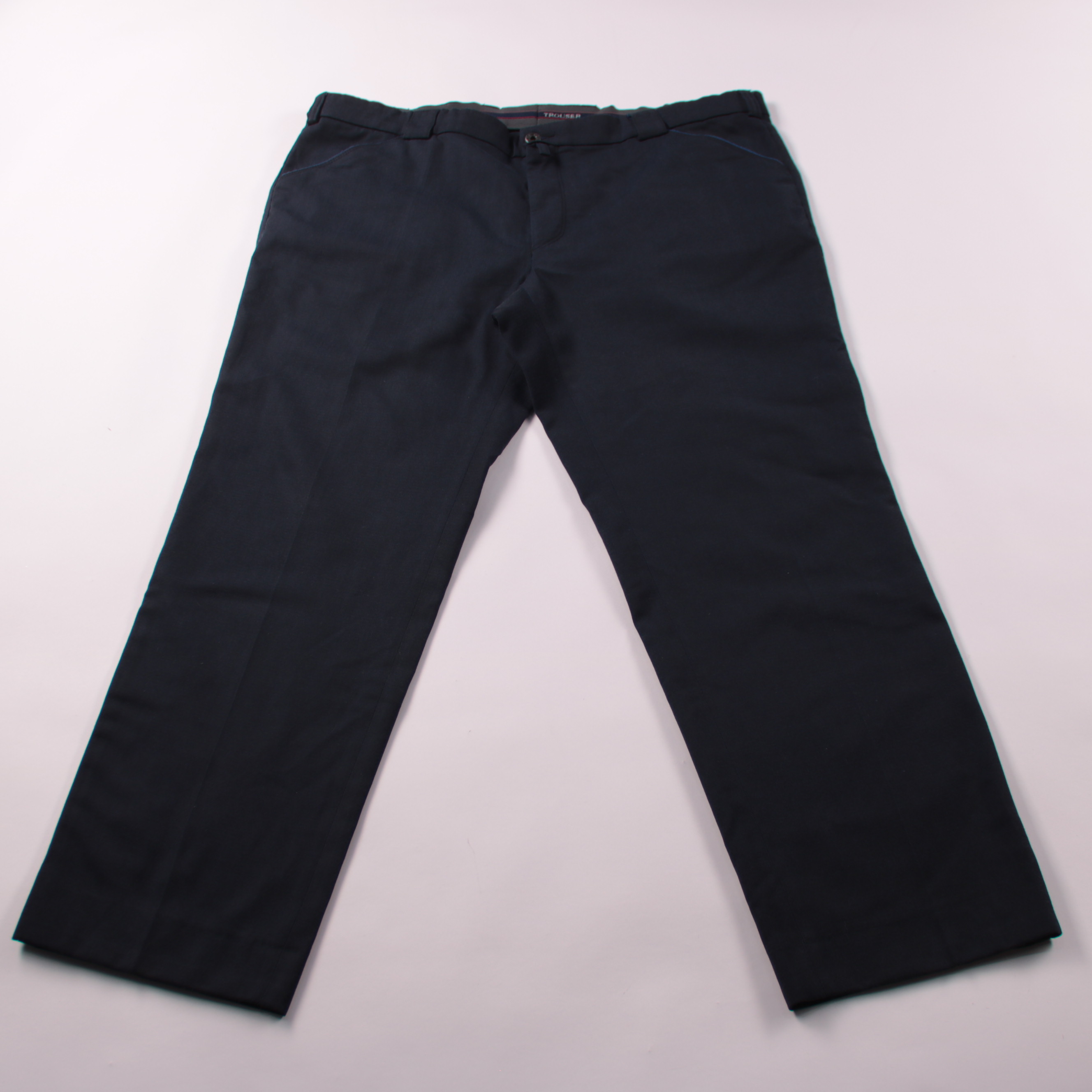 Мужские брюки тёмно-синего цвета, подойдут для офиса и повседневной носки. Плотная смесовая ткань с добавлением эластана держит форму и даёт комфорт в движении. Практичный вариант: легко сочетаются с рубашкой или джемпером и не требуют сложного ухода.
