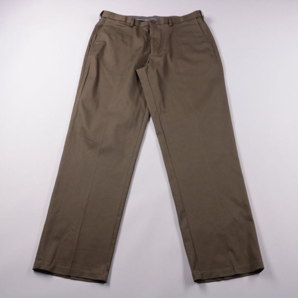 Мужские брюки Haggar Premium No Iron Khaki Classic Fit, прямой крой со стрелками и скрытым расширяемым поясом. Подойдут для офиса и повседневных образов в стиле casual. Ткань со стрейчем и «no iron» — меньше мнётся и проще в уходе, можно стирать в машине.