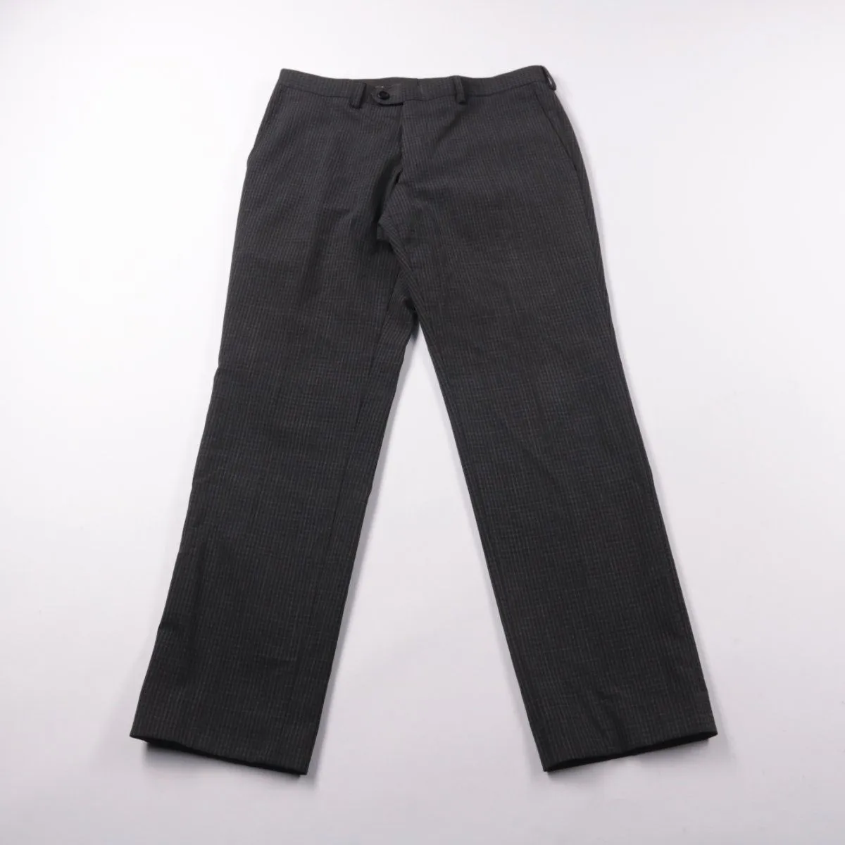 Мужские классические брюки в тёмно-сером цвете с мелким узором в клетку. Подойдут для офиса и повседневных образов с рубашкой или свитером. Практичный материал хорошо держит форму и легко сочетается с базовой обувью.