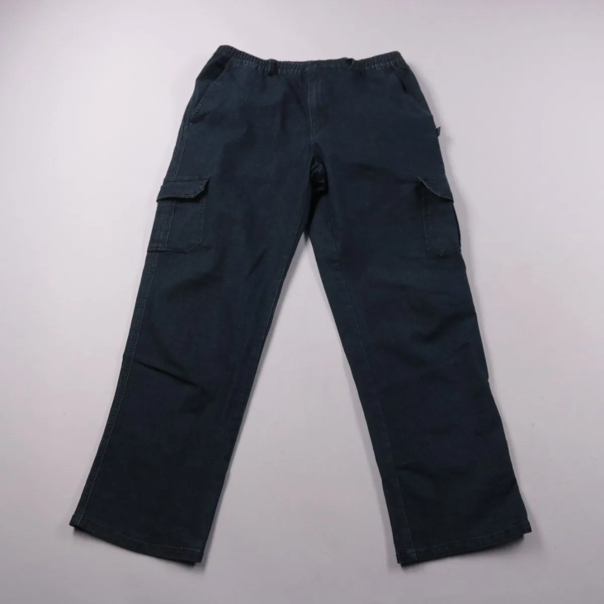 Мужские брюки карго из денима с боковыми накладными карманами и эластичным поясом. Подойдут для повседневной носки и прогулок в городе в любой сезон. Практичны за счёт вместительных карманов и ткани с добавлением спандекса.