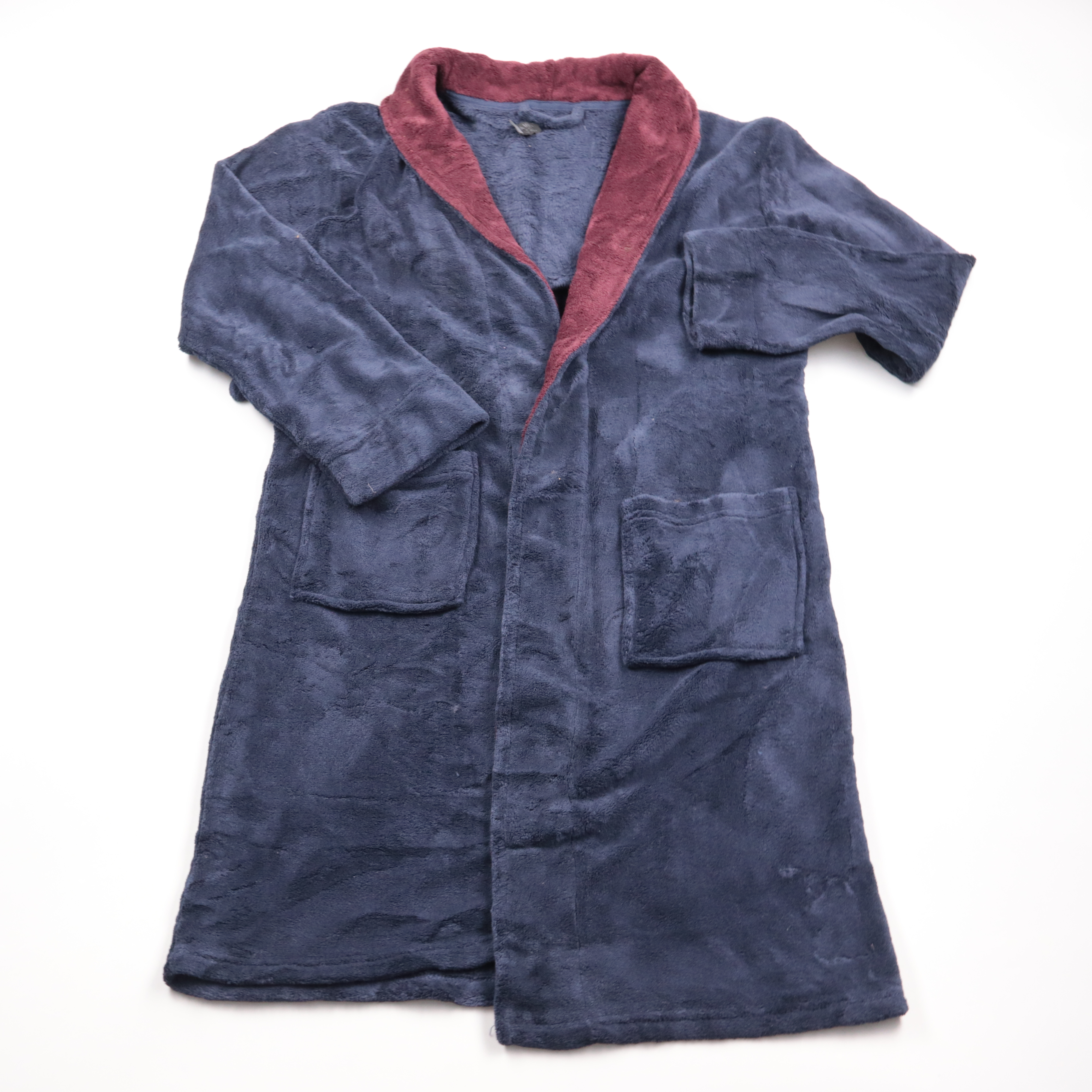 Мягкий домашний халат Primark из флиса, тёмно-синего цвета с бордовой отделкой воротника. Подойдёт для дома, после душа или в поездки, когда нужен тёплый слой. Практичные накладные карманы и приятный на ощупь материал быстро сохнут и не требуют сложног...