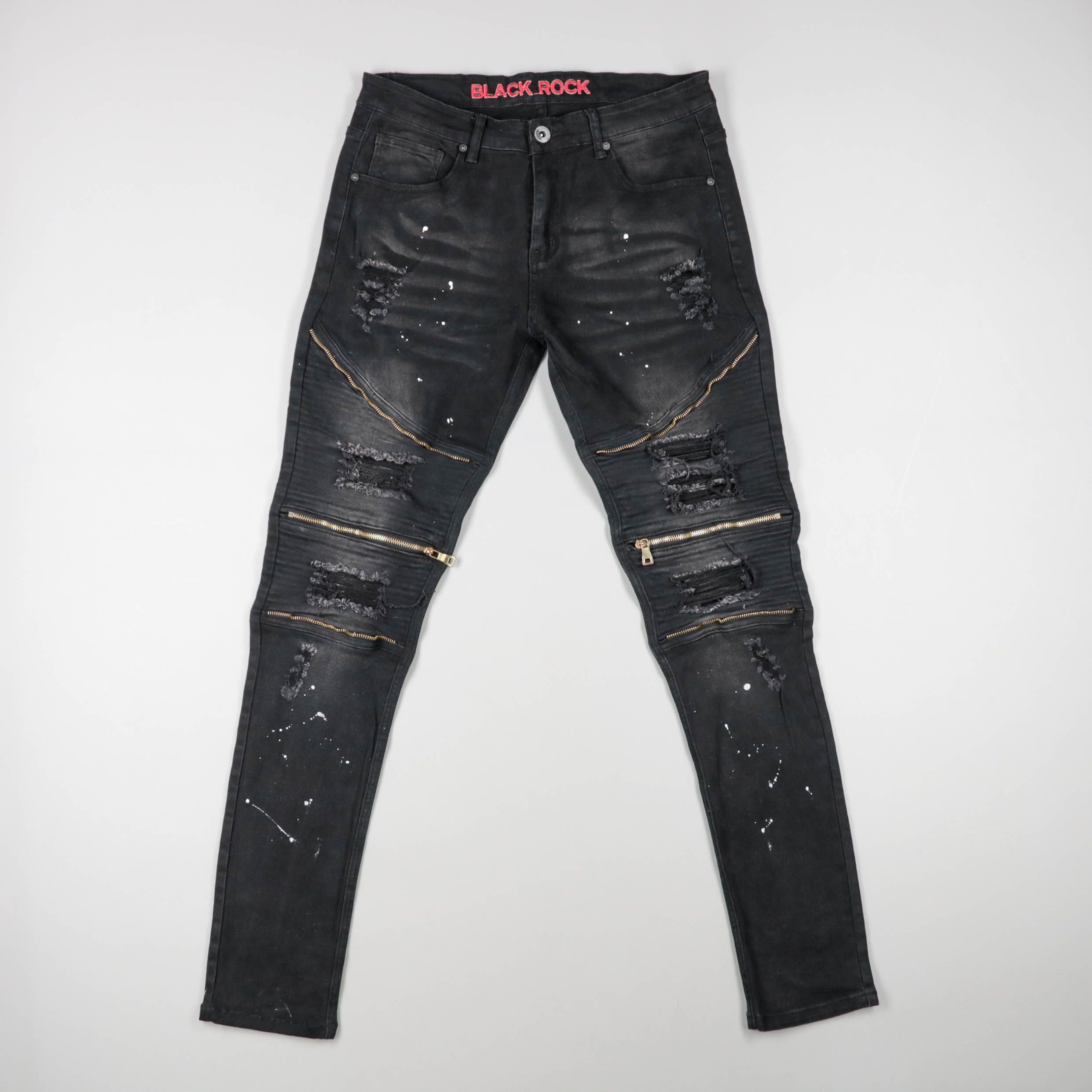 Мужские джинсы Black Rock в чёрном цвете с декоративными молниями и эффектом потертостей/брызг краски. Подойдут для повседневных и вечерних образов в стиле streetwear. Плотный деним хорошо держит форму и рассчитан на активную носку.