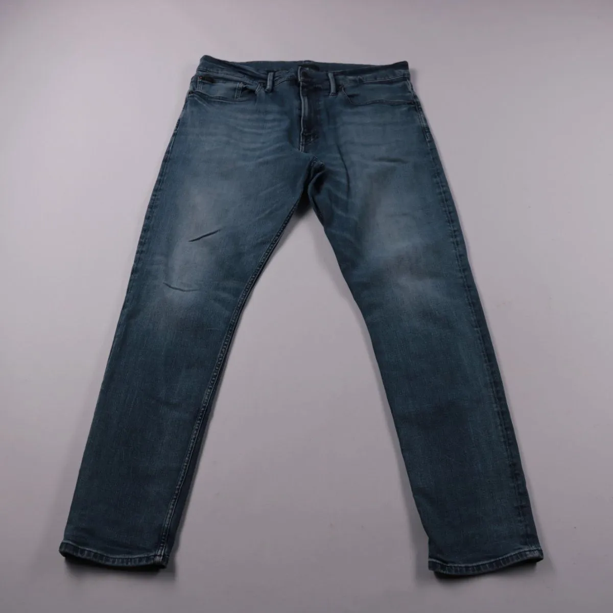 Мужские джинсы Polo Ralph Lauren из синего денима с лёгкими потертостями. Подойдут для повседневной носки и casual-образов с футболкой, рубашкой или худи. За счёт добавления эластана ткань чуть тянется и комфортнее сидит в движении.