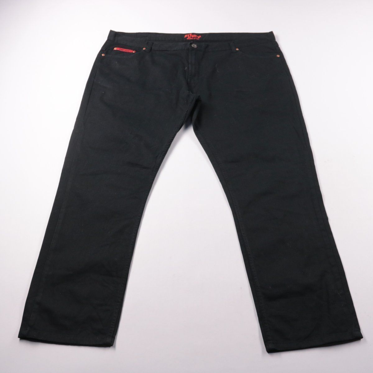 Мужские джинсы Duke из плотного хлопка, чёрного цвета с красными акцентами на фурнитуре и вышивке. Подойдут для повседневной носки и более аккуратных образов благодаря лаконичному крою. Практичный плюс — натуральный материал и тёмный цвет, который легко сочетать с любой обувью и верхом.