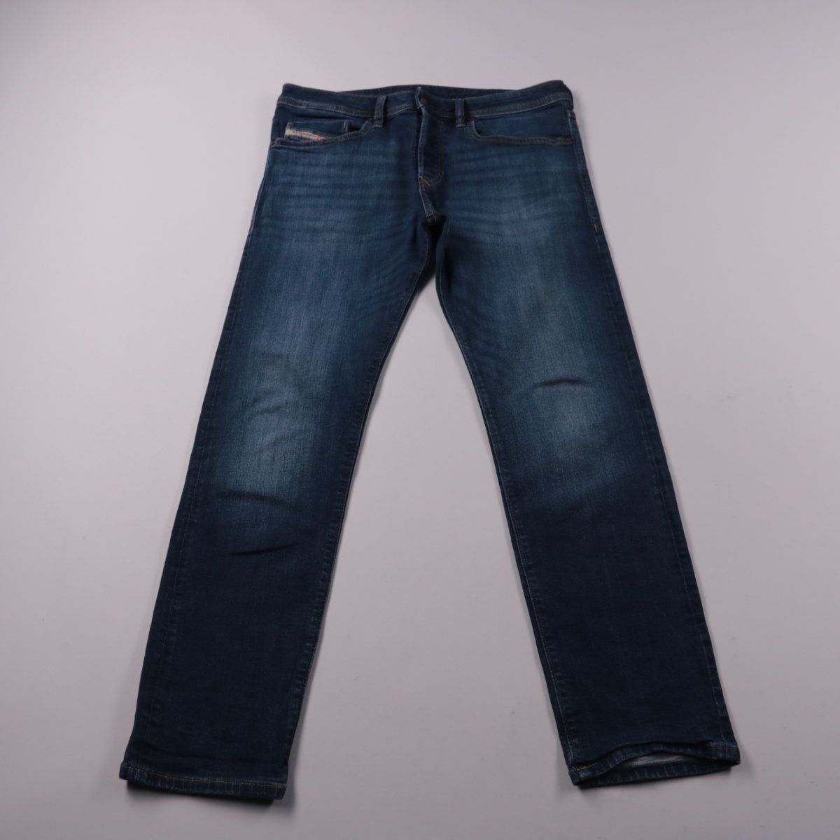 Мужские джинсы Diesel из тёмно-синего денима с лёгким эффектом потертости. Подойдут для повседневной носки и неформальных образов в любое время года. Благодаря добавлению эластана ткань чуть тянется и комфортнее сидит в движении.