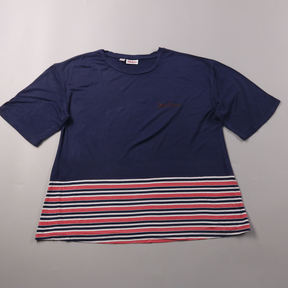 Мужская футболка John Baner тёмно-синего цвета с контрастной полосатой вставкой по низу. Подойдёт для повседневной носки и летних прогулок, легко сочетается с джинсами и шортами. Практичный вариант: мягкий трикотаж и тёмный цвет менее маркий в носке.