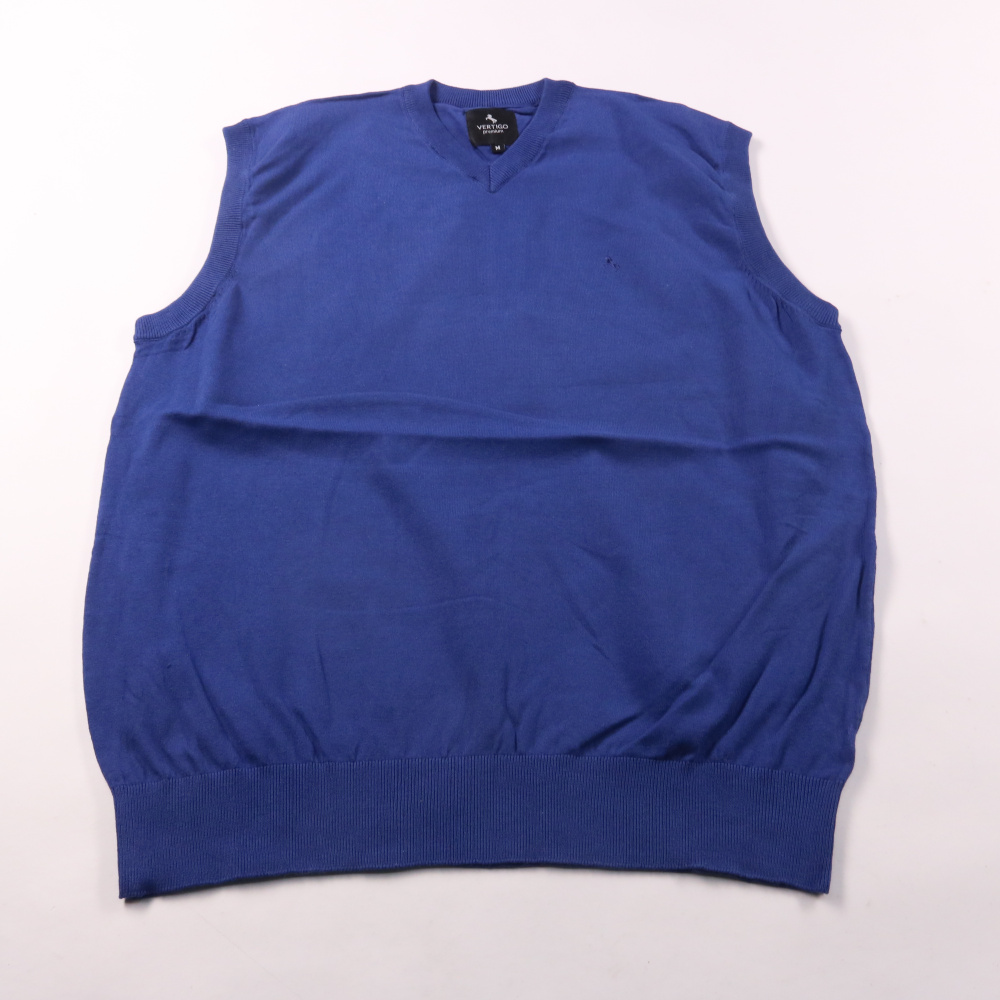Мужской трикотажный жилет Vertigo Premium синего цвета с V-образным вырезом. Подойдёт для офиса и повседневных образов, удобно носить поверх рубашки или лонгслива. Хлопок в составе приятен к телу, а добавка нейлона делает изделие более износостойким.