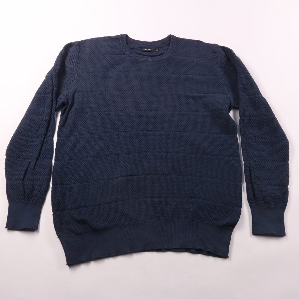Мужской свитшот Portonova тёмно-синего цвета с фактурной тканью и эластичными манжетами/низом. Подойдёт для повседневной носки в прохладную погоду и для офиса в стиле casual. Натуральный хлопок приятен к телу и хорошо дышит.