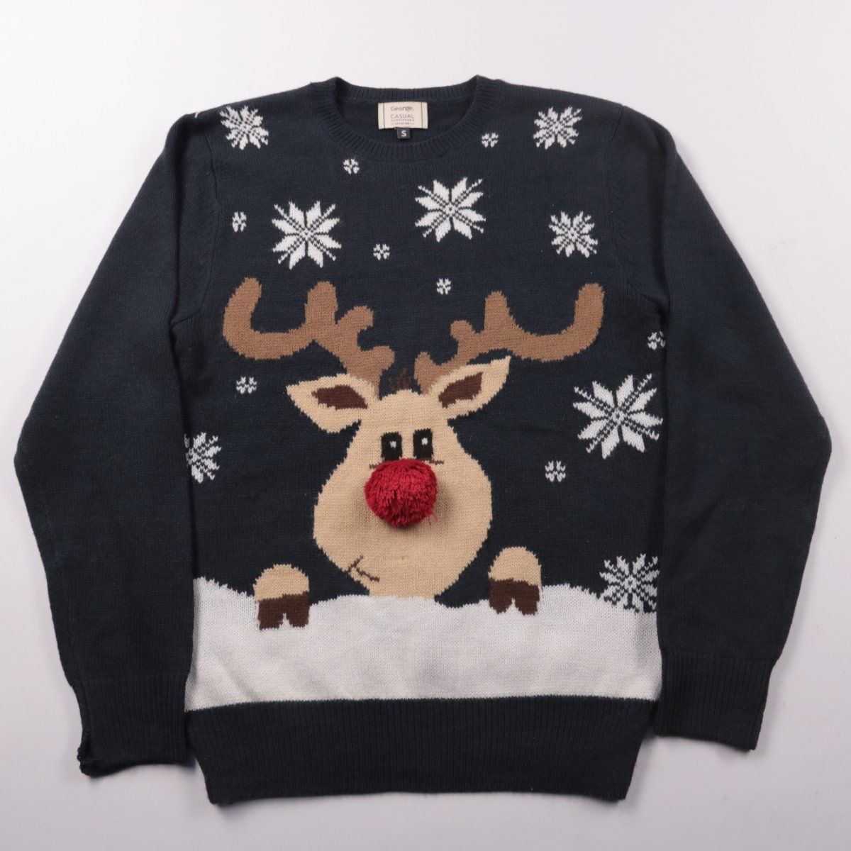 Новогодний свитер George с объёмным принтом оленя и снежинками, тёплый и мягкий на ощупь. Отлично подойдёт для зимних прогулок, праздников и фотосессий в стиле Christmas. Практичный акрил легко стирается и быстро сохнет.