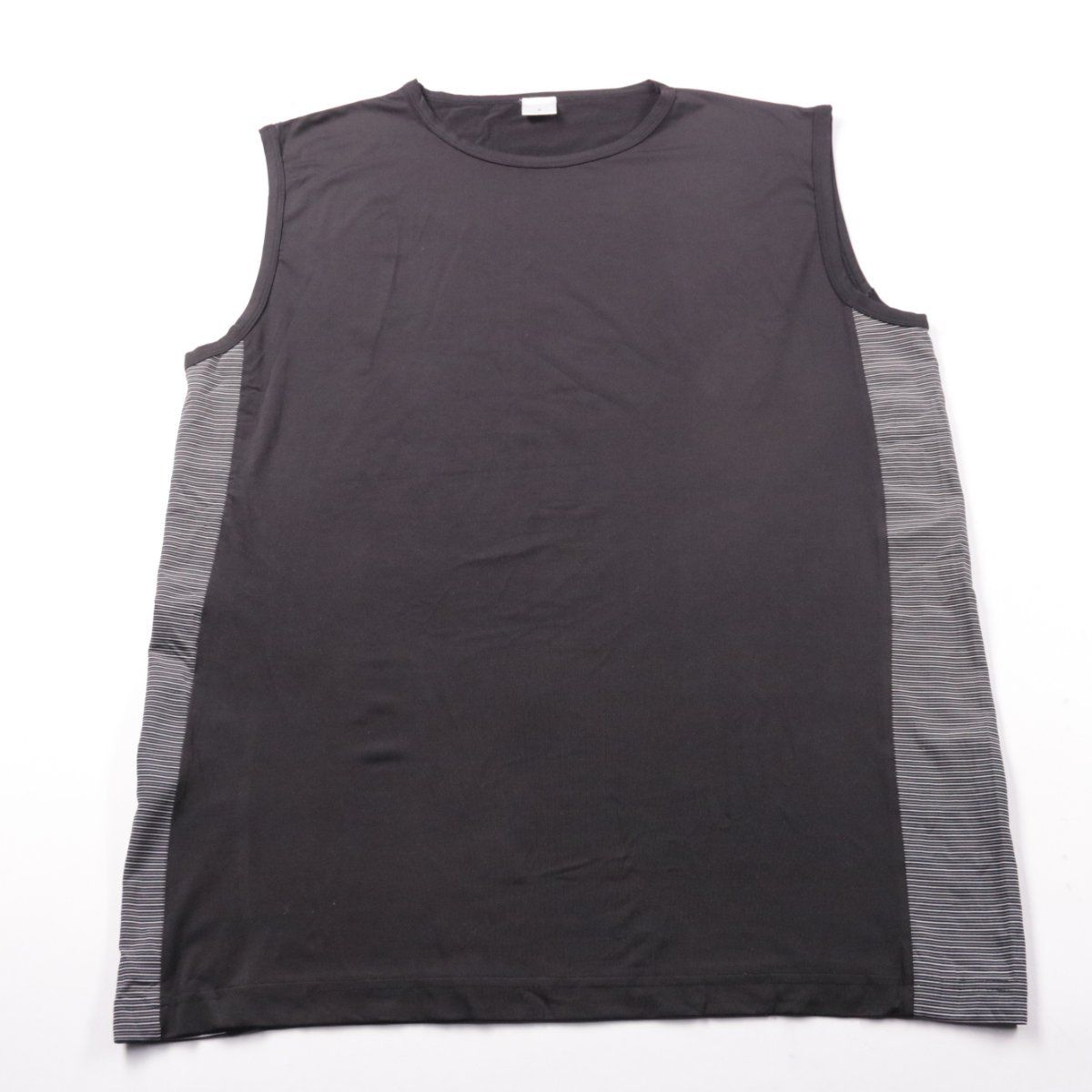 Мужская спортивная майка без бренда, чёрного цвета с серыми вставками по бокам. Подойдёт для тренировок и активного отдыха, лёгкая и тянется за счёт эластана. Практична в носке: быстро сохнет и не стесняет движений.