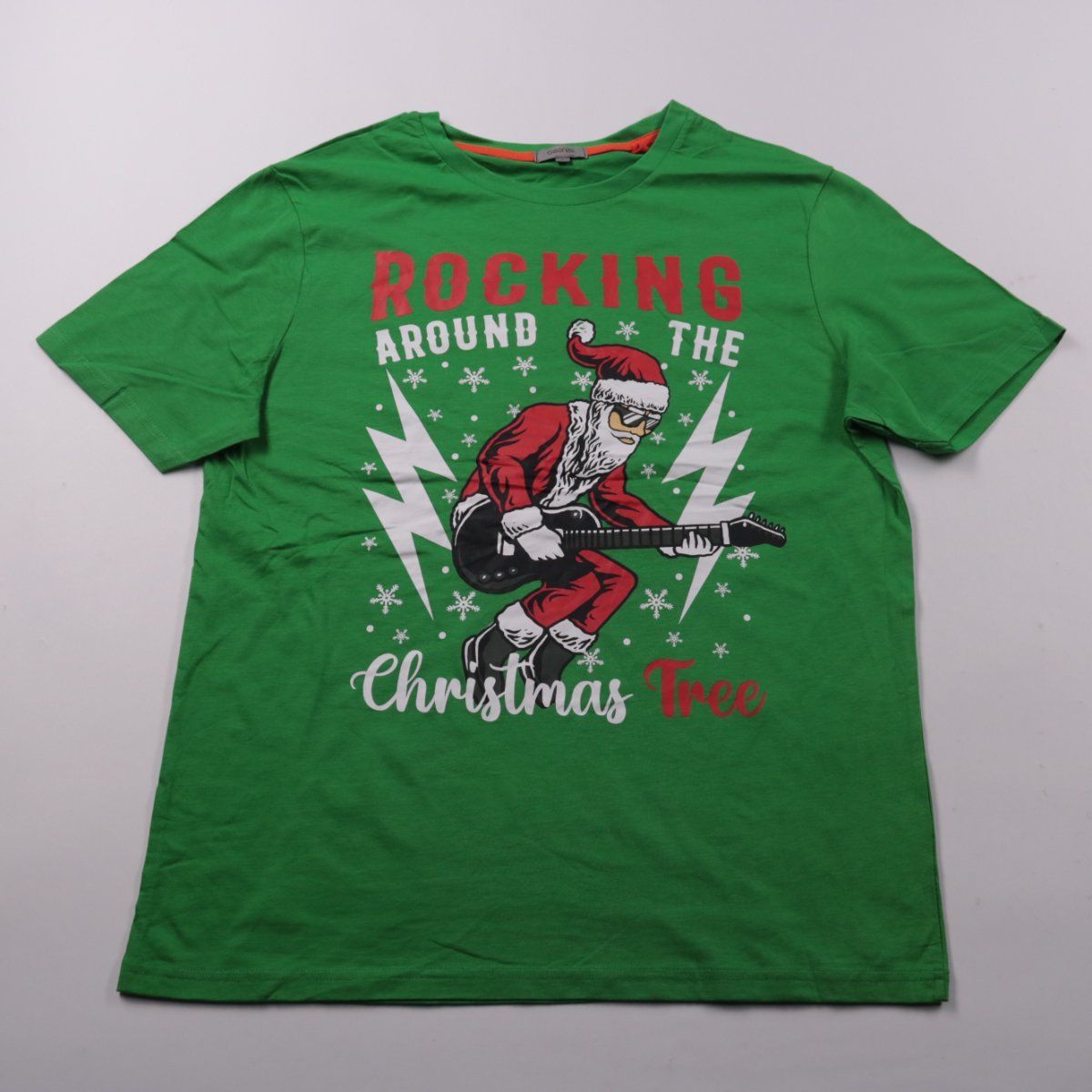 Мужская футболка George зелёного цвета с крупным новогодним принтом «Rocking around the Christmas Tree» (Санта с гитарой). Подойдёт для повседневной носки и тематических праздничных мероприятий. Натуральный хлопок приятен к телу и хорошо дышит.
