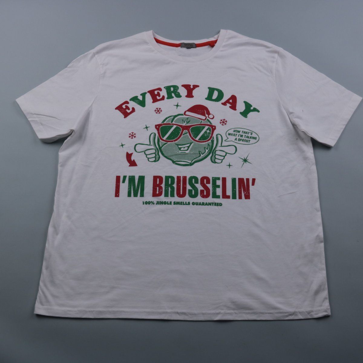 Мужская футболка George белого цвета с новогодним принтом и надписью «EVERY DAY I’M BRUSSELIN’». Подойдёт для повседневной носки и тематических праздничных образов. Ткань с добавлением эластана немного тянется и комфортно сидит.