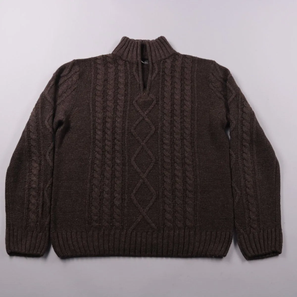 Мужской свитер Mauro Ferrini тёмно-коричневого цвета с рельефной вязкой «косы» и высоким воротником на молнии. Подойдёт для повседневной носки в холодную погоду и в офис под куртку или пальто. Плотная вязка хорошо сохраняет тепло и держит форму.