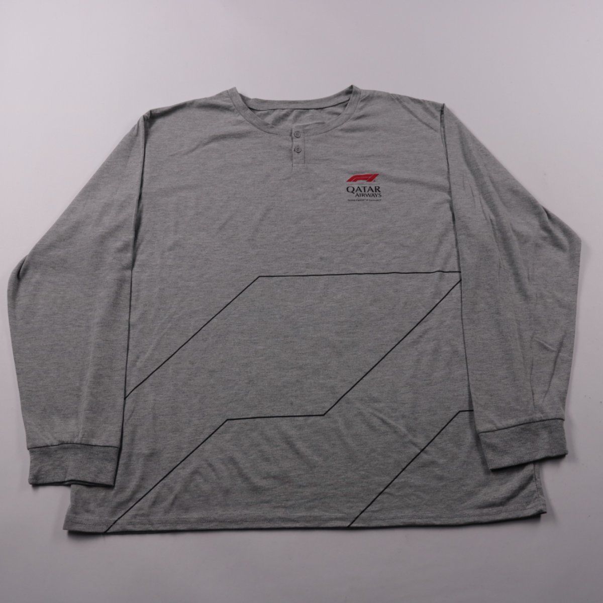 Мужская футболка-лонгслив Matrix серого меланжа с планкой на пуговицах и логотипом Qatar Airways/F1 на груди. Подойдёт для повседневной носки и путешествий в прохладную погоду. Практична в уходе, выполнена из ткани с добавлением переработанного полиэстера.